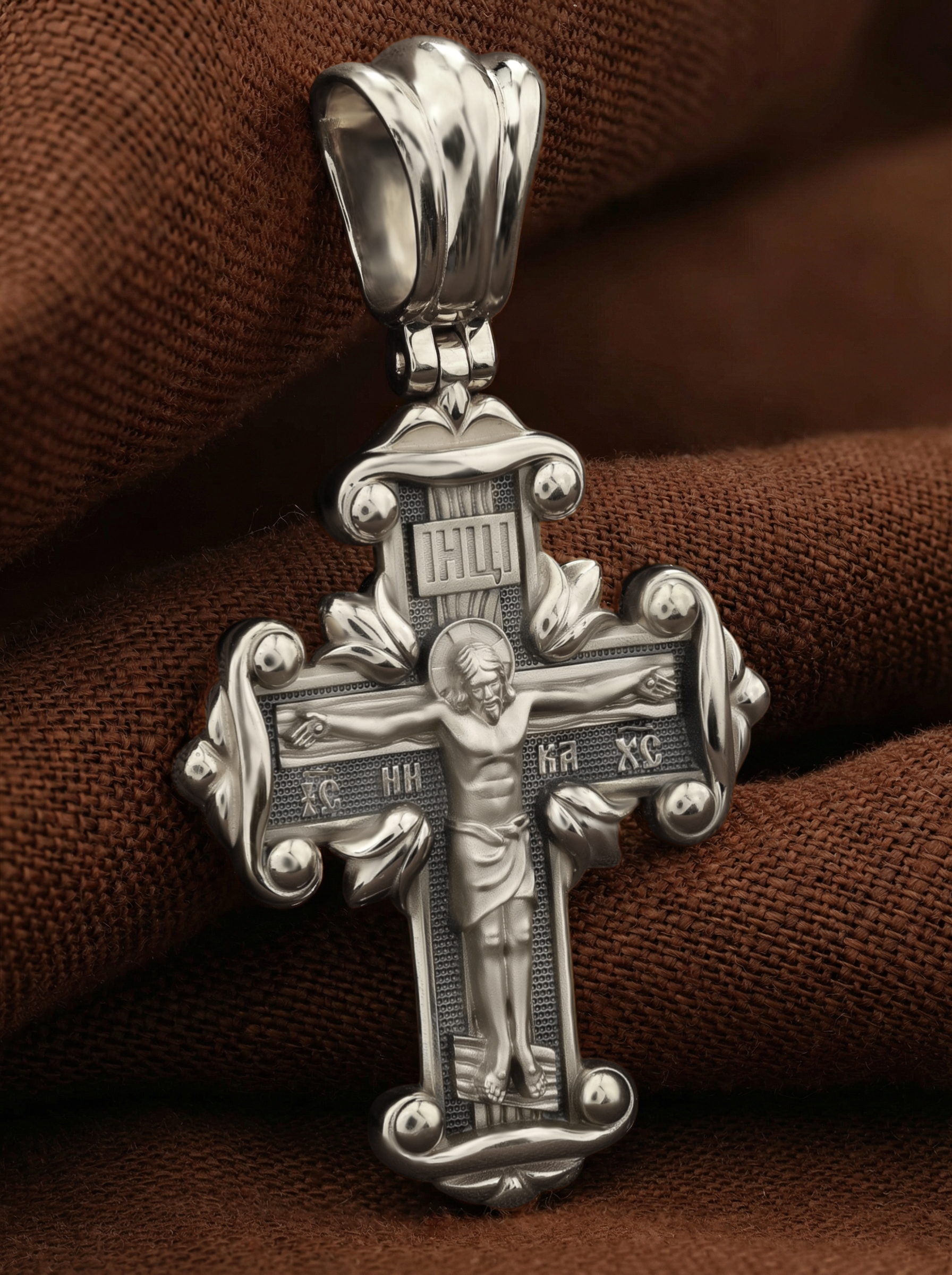 На лицевой стороне креста изображено Распятие Господа и Спасителя нашего Иисуса Христа, отдавшего Себя на смерть, для искупления грехов мира. Крест является символом жертвенной любви Всеблагого Бога к падшим людям, всепобеждающим духовным оружием христиан, основанием и средоточием церковной жизни. Господь сказал: кто хочет идти за Мною, отвергнись себя, и возьми крест свой, и следуй за Мною. (Мк. 8: 34). На верхней табличке, выше головы Иисуса, расположена надпись, составленная Понтием Пилатом — «IНЦI». Она означает «Иисус Назорей, Царь Иудейский». Надпись «IC» «ХC», означает Иисус Христос, помещается на разных сторонах поперечной перекладины креста. Рядом — слово «НИКА», что означает «победитель». На православном кресте Христос не умирает, а свободно простирает руки, ладони Иисуса открыты, будто он хочет обнять все человечество, даря им свою любовь и открывая путь к вечной жизни.