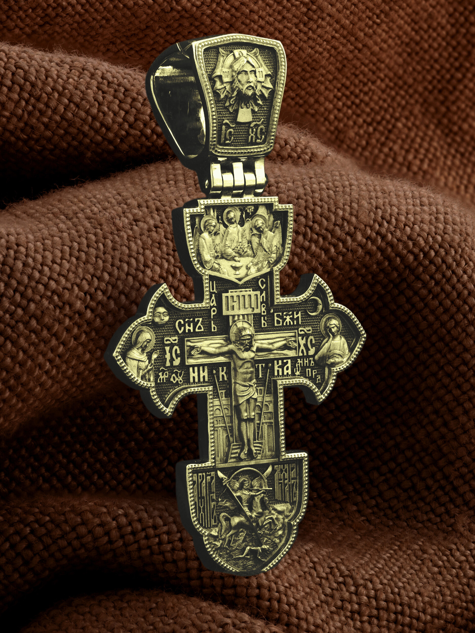 На лицевой стороне креста изображено Распятие Господа и Спасителя нашего Иисуса Христа. Крест- символ спасения и искупления рода человеческого, знамение победы над смертью и адом. Иисус Христос, как искупительная жертва освобождения человечества от власти греха, умер крестной смертью и в третий день воскрес. На верхней табличке, выше головы Иисуса, расположена надпись, составленная Понтием Пилатом — «IНЦI». Она означает «Иисус Назорей, Царь Иудейский». Распятие сопровождается каноническими надписями. Над Распятием находится надпись «Царь Славы». Надпись «IС» « ХС» означает Иисус Христос и помещается на разных сторонах поперечной (большой) перекладины креста. Рядом расположены надпись «Сын Божий» и слово «НИКА», что означает «победитель». Слева от Распятия изображена Пресвятая Богородица, справа — апостол и евангелист Иоанн Богослов, один из ближайших учеников Иисуса Христа. За Распятием высится Иерусалимская стена, в знак того, что Господь был распят вне стен города. Вдоль креста изображены копие сотника Лонгина и трость с губкой и буквы «К» и «Т». Рядом — слово «НИКА», что означает «победитель». Над распятием помещено изображение иконы Святой Троицы в виде трех ангелов. Ниже распятия изображен Архангел Михаил, восседающим на огненном крылатом коне. От уст архангела исходит труба, возвещающая наступление Второго пришествия и Страшного суда, а над его распростертыми крыльями изображена радуга. Копьем с крестом он пронзает поверженного сатану. На кулонном кольце изображен Нерукотворный образ Господа и Спасителя нашего Иисуса Христа, чудесно отпечатавшийся на плате, котором Христос вытер свой лик.