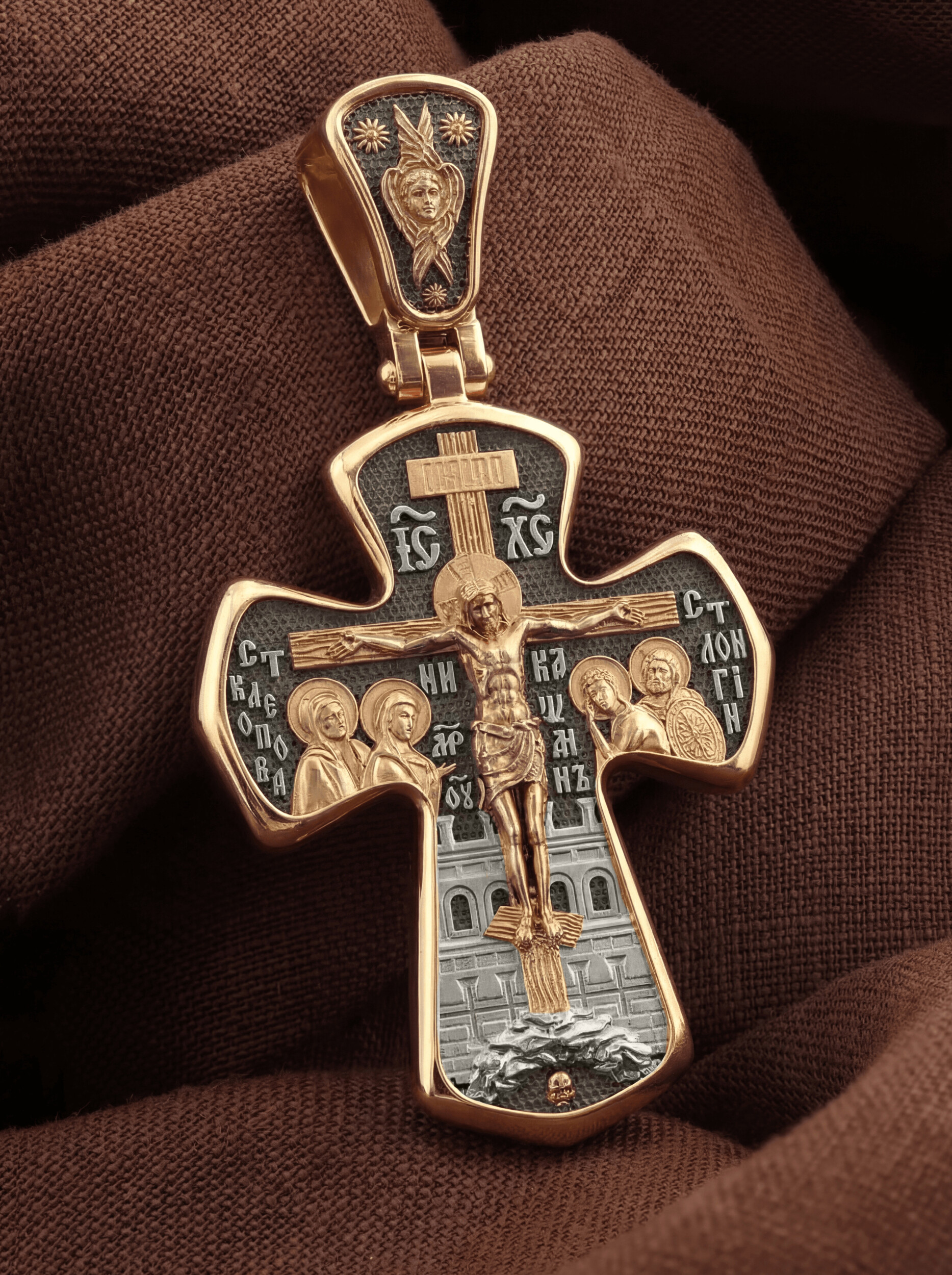 На лицевой стороне креста изображено Распятие Господа и Спасителя нашего Иисуса Христа, отдавшего Себя на смерть, для искупления грехов мира. Господь сказал: кто хочет идти за Мною, отвергнись себя, и возьми крест свой, и следуй за Мною. (Мк. 8: 34). Крест является символом жертвенной любви всеблагого Бога к падшим людям, всепобеждающим духовным оружием христиан, основанием и средоточием церковной жизни. На верхней перекладине помещена надпись «IС» « ХС», что означает Иисус Христос. Ниже — слово «НИКА», что означает «победитель». Слева от Распятия изображена Пресвятая Богородица, справа — апостол и евангелист Иоанн Богослов, один из ближайших учеников Иисуса Христа. За Распятием высится Иерусалимская стена, в знак того, что Господь был распят вне стен города. Возвышение, на котором стоит Крест, символизирует гору Голгофу, на которой произошло Распятие. Под подножием Креста изображена покоящаяся голова (череп) Адама. На кулонном кольце помещен крест