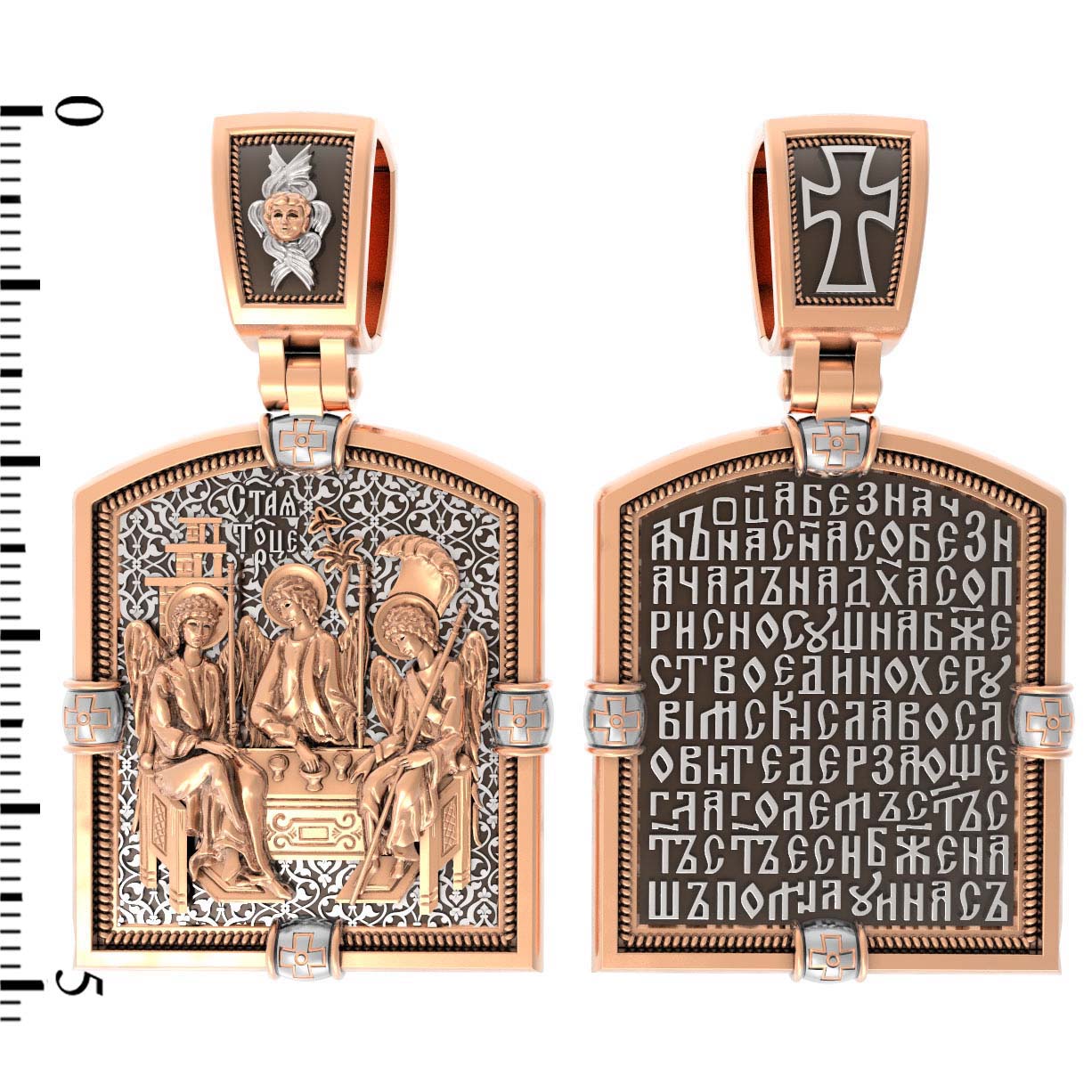 Основой композиции лицевой стороны является икона Святой Троицы.
