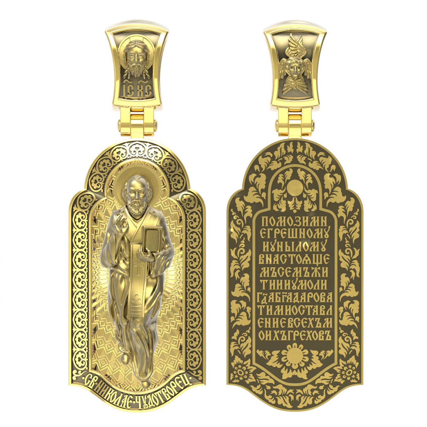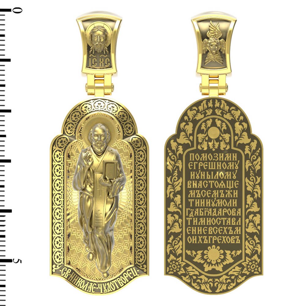 На лицевой стороне образка изображен Святитель Николай архиепископ Мир Ликийских, Чудотворец. Он является одним из самых почитаемых святых в православном мире. Избранник Божий Николай стал вершиной всех добродетелей. С кем из величайших праведников не сравнялся он образом духовной красоты, кому из них не последовал в своих деяниях и чудотворениях? Всеблаженный Николай был кроток, как Моисей, мужественен, как Давид, славен простотой нрава, как Иаков. Словно Ной, он спасал стадо Господне в новом ковчеге от потопа ересей. Вся жизнь святого Николая — это служение Богу. Много великих чудес сотворил на земле и на море великий Святитель Николай Угодник. Он укрощал штормы, спасал от потопления и выносил на сушу из глубины морской, освобождал из плена и приносил освобожденных домой, избавлял от уз и темницы, освобождал от смерти и подавал многим различные исцеления: слепым — прозрение, хромым — хождение, глухим — слух.