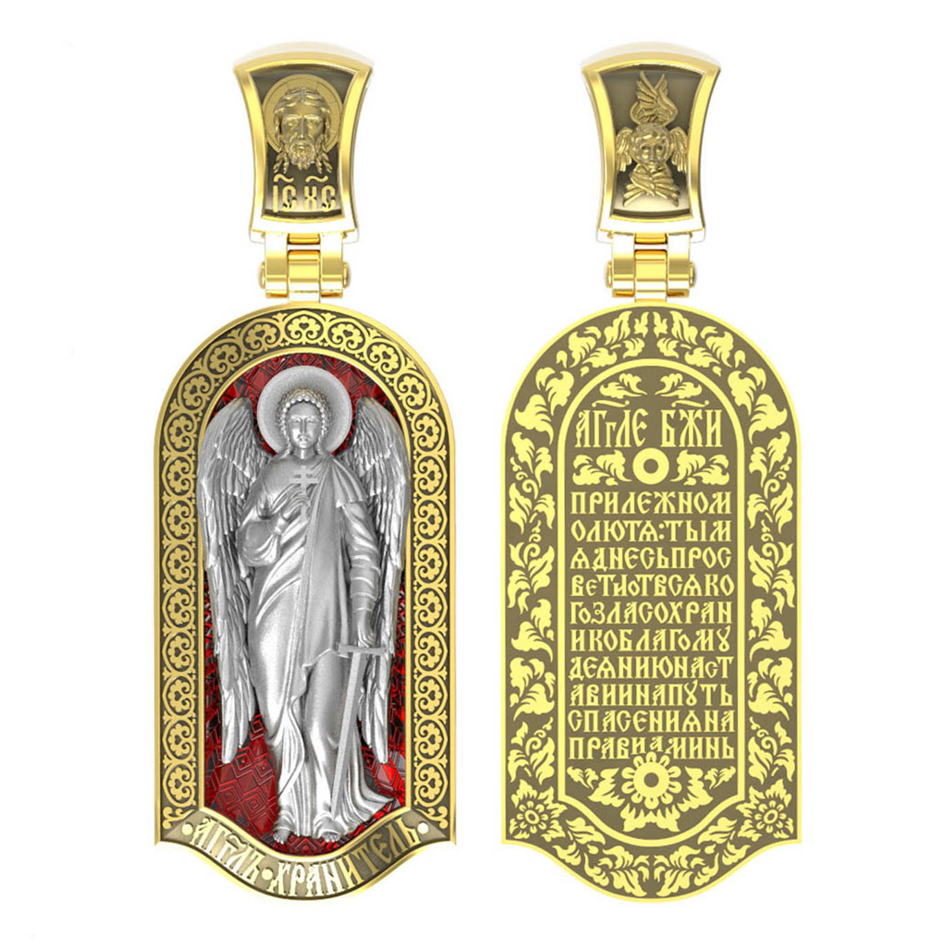 Основой композиции лицевой стороны является Ангела Хранителя. Образок Ангел Хранитель — это не просто украшение, а настоящая миниатюрная икона. В руках Ангел держит традиционные символические атрибуты Ангелов Хранителей: крест — знак послушания Христу и следования Его заповедям, меч — символ непримиримой борьбы, которую он ведет с бесами, отражая их нападения на людей. Слово «ангел» означает «вестник». Ангелы — верные служители Божьи, которых Господь посылает возвещать Свои повеления. Ангелы тварны, как и люди, но имеют другую природу. На иконах они изображаются в человеческом обличье с большими крыльями. Могучие крылья ангелов символизируют быстроту, с которой они исполняют повеления Бога, а небольшие ленточки у ушей –тороки, или слухи — показывают, что они всегда слышат Его голос.