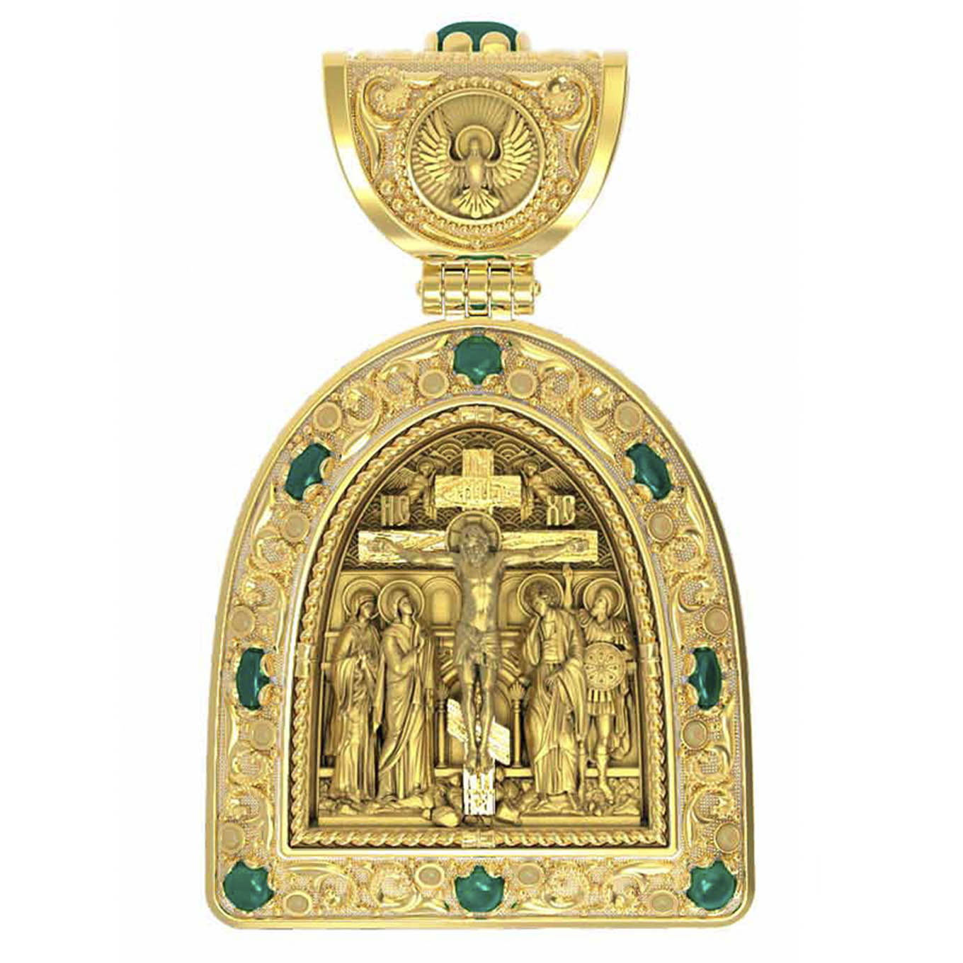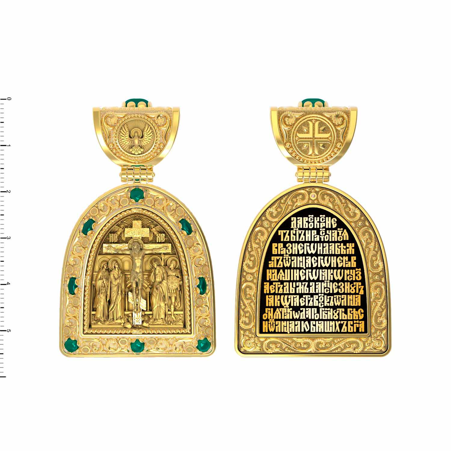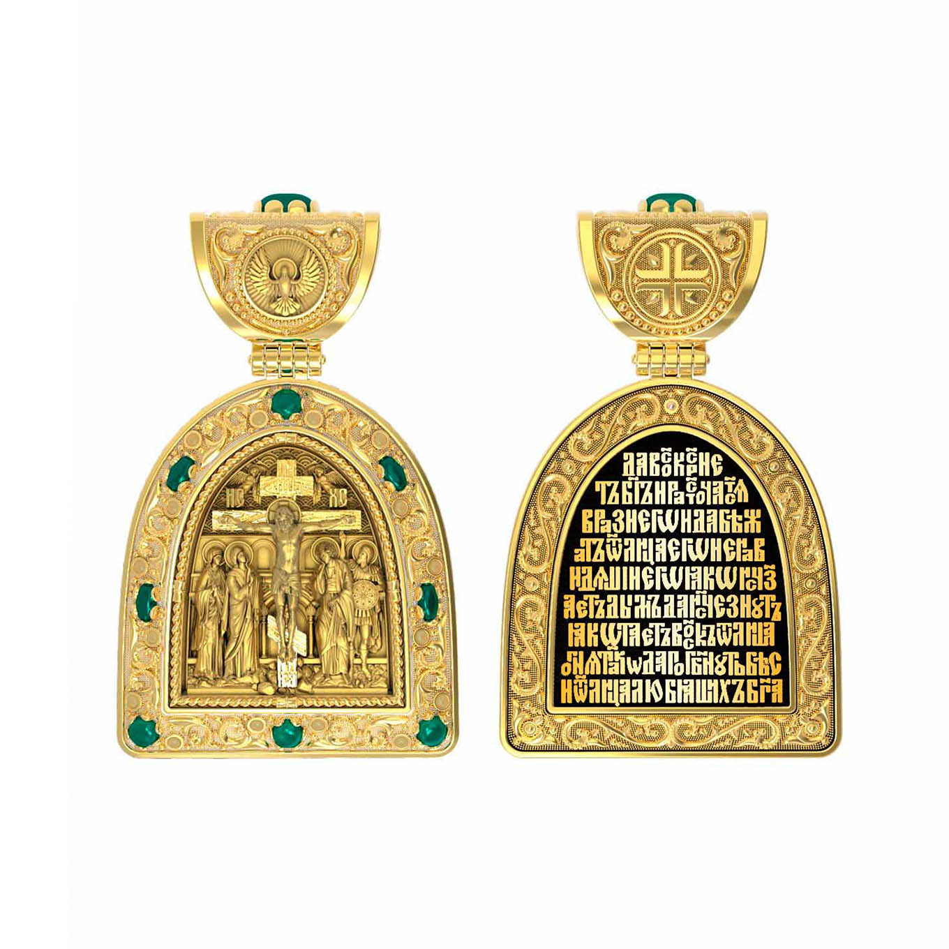 На лицевой стороне образка изображено Распятие Господа Иисуса Христа. Справа от Господа изображены Божия Матерь и святая Мария Клеопова, слева — святой апостол Иоанн и святой Лонгин Сотник. Все эти святые вместе с Богоматерью находлились на Голгофе при казни Спасителя.