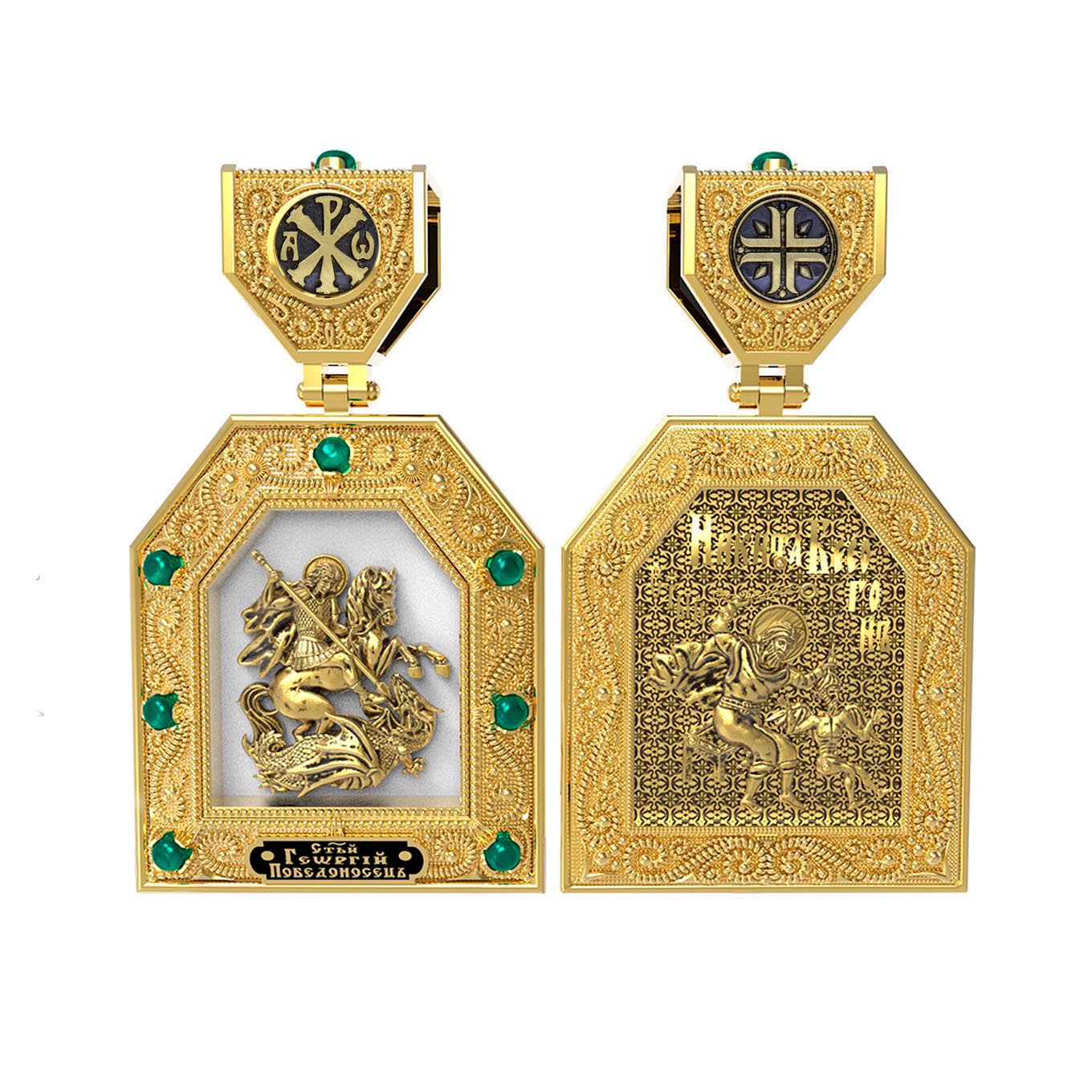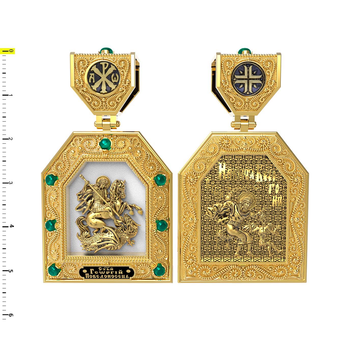 Основой композиции лицевой стороны образка является изображение Святого Великомученика Георгия Победоносца — одного из самых почитаемых и удивительных святых. На Руси он известен как Юрий или Егорий, покровитель воинов, помощник в крестьянском труде. На образке он изображен как воитель, сидящий на вздыбленном коне и поражающий копьем огнедышащего змея. Змей символизирует собою сатанинские силы. Молитвами вознесенными к Всевышнему и своей непреклонной верой он смог одолеть чудовище. Святой убил змея, спас царскую дочь, принесенную в жертву, и жителей города, их души от влияния дьявола, породив в них надежду и веру в Господа, призывая людей принять христианскую веру.