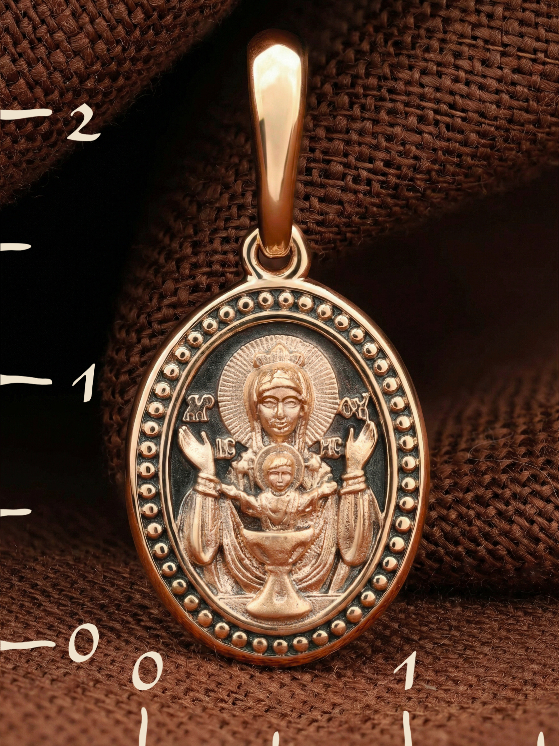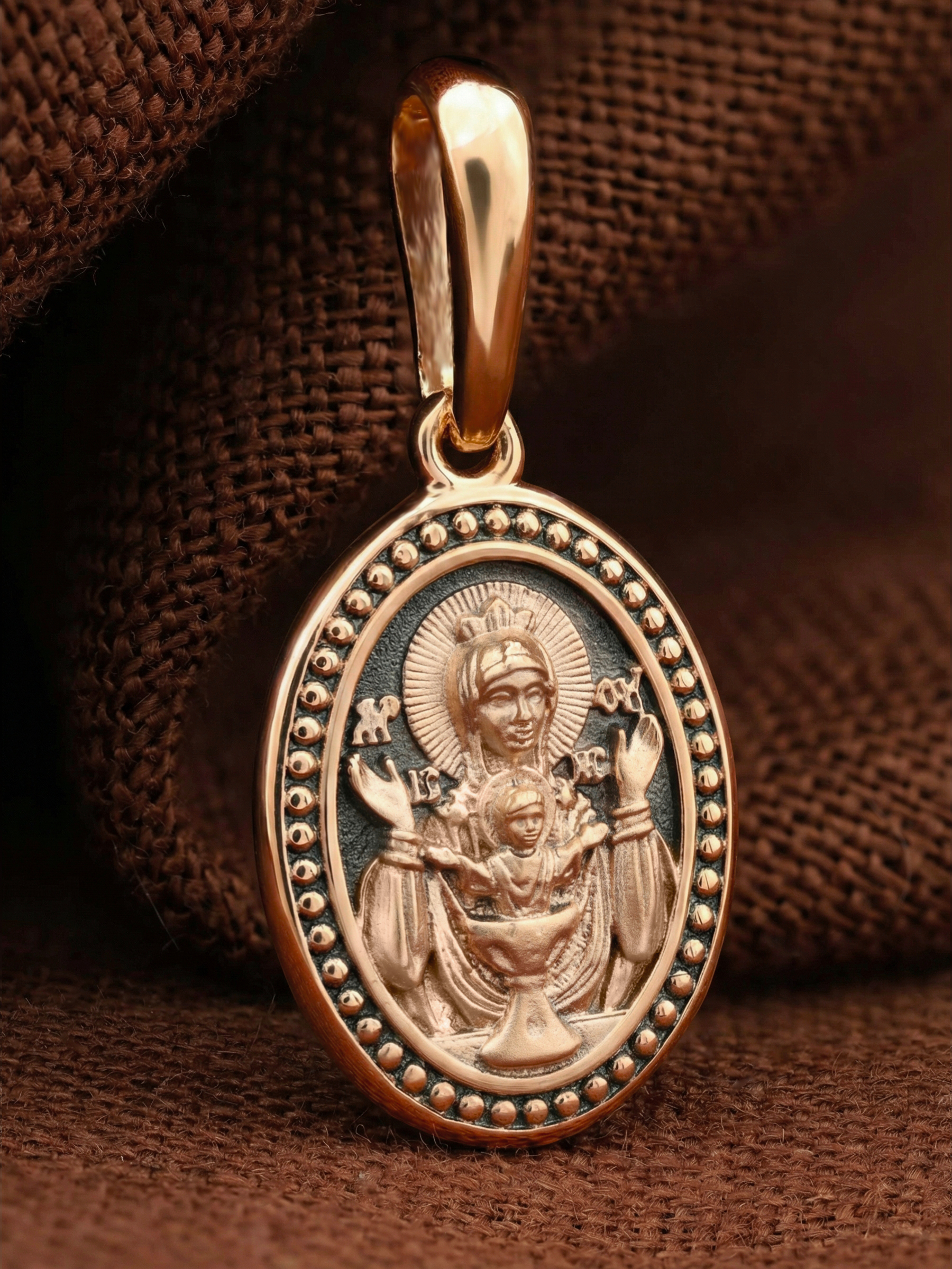 На лицевой части образка изображена икона Божией Матери «Неупиваемая чаша». Икона славится помощью в исцелении зависимостей, помогает людям обрести свободу от греховных страстей.