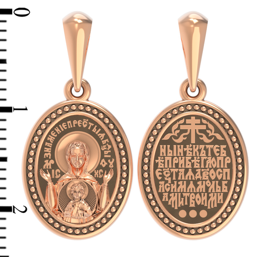 В центр образка помещен образ Божией Матери «Знамение», прославившийся многими чудесами в Новгороде в XII веке. Икона эта чтится как одна из самых великих святынь Русской земли. Молитвенно воздетые руки Богородицы означают заступничество за людей пред Богом. Рядом с Ней, на фоне круглого щита, — благословляющий Божественный Младенец — Спас-Эммануил.