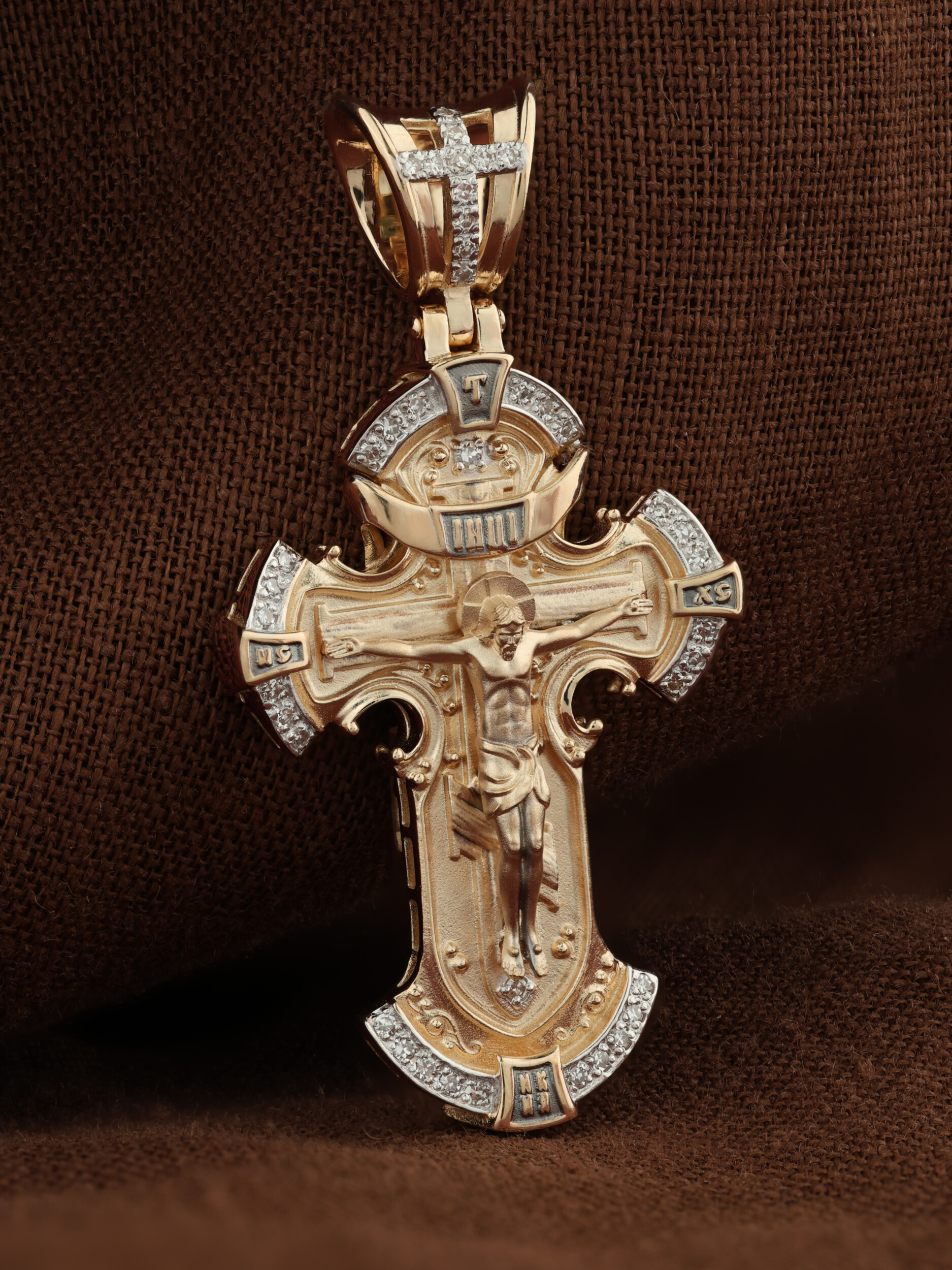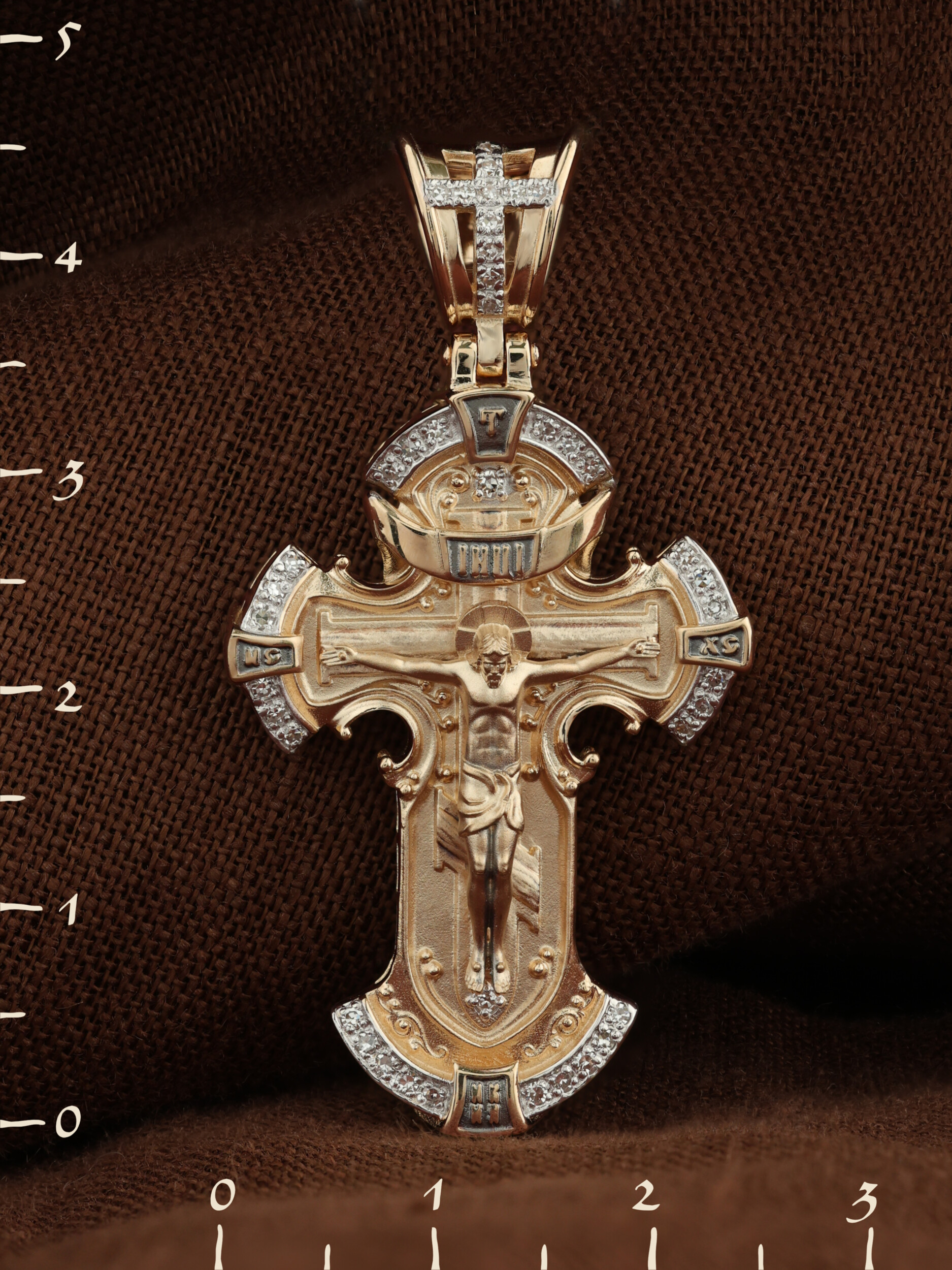 На лицевой стороне креста изображено Распятие Господа и Спасителя нашего Иисуса Христа, отдавшего Себя на смерть, для искупления грехов мира. Крест является символом жертвенной любви Всеблагого Бога к падшим людям, всепобеждающим духовным оружием христиан, основанием и средоточием церковной жизни. Господь сказал: кто хочет идти за Мною, отвергнись себя, и возьми крест свой, и следуй за Мною. (Мк. 8: 34). Верхняя перекладина символизирует титло — табличка, на которой, согласно Евангелию, было начертано: Иисус Назорей Царь Иудейский (IНЦI). Справа и слева от Распятия изображены символы «IС ХС» — святое имя Христа. Внизу креста написано слово «НИКА», что значит «победитель». В верхней части креста обозначена буква «Т», которая символизирует одно из орудий страданий Господа — трость.
