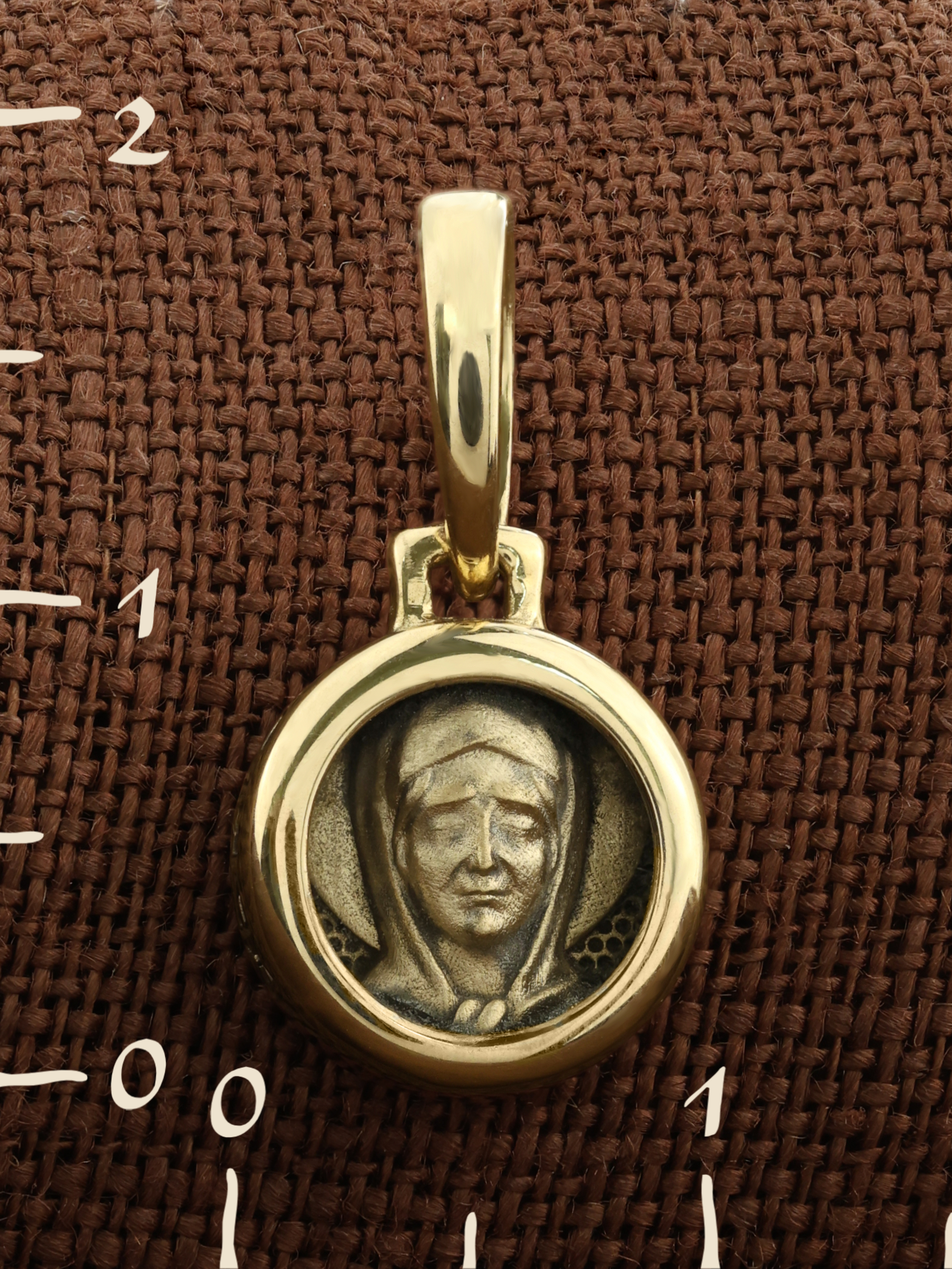 На лицевой стороне образка изображена Святая Матрона Московская. Родилась блаженная Матрона (Матрона Дмитриевна Никонова) в 1881 г. в деревне Себино Тульской губернии, недалеко от знаменитого Куликова поля, в бедной, но благочестивой крестьянской семье. Кроме Матроны, в семье уже было трое детей: двое братьев и сестра. Поэтому мать Матроны решила отдать будущего ребенка в приют, но увидела вещий сон. Еще не родившаяся дочь явилась ей во сне в виде белой птицы с человеческим лицом и закрытыми глазами и села ей на правую руку. Приняв сон как знамение, богобоязненная женщина отказалась от мысли отдать ребенка в приют. Дочь родилась слепой, но мать любила свое «дитя несчастное».