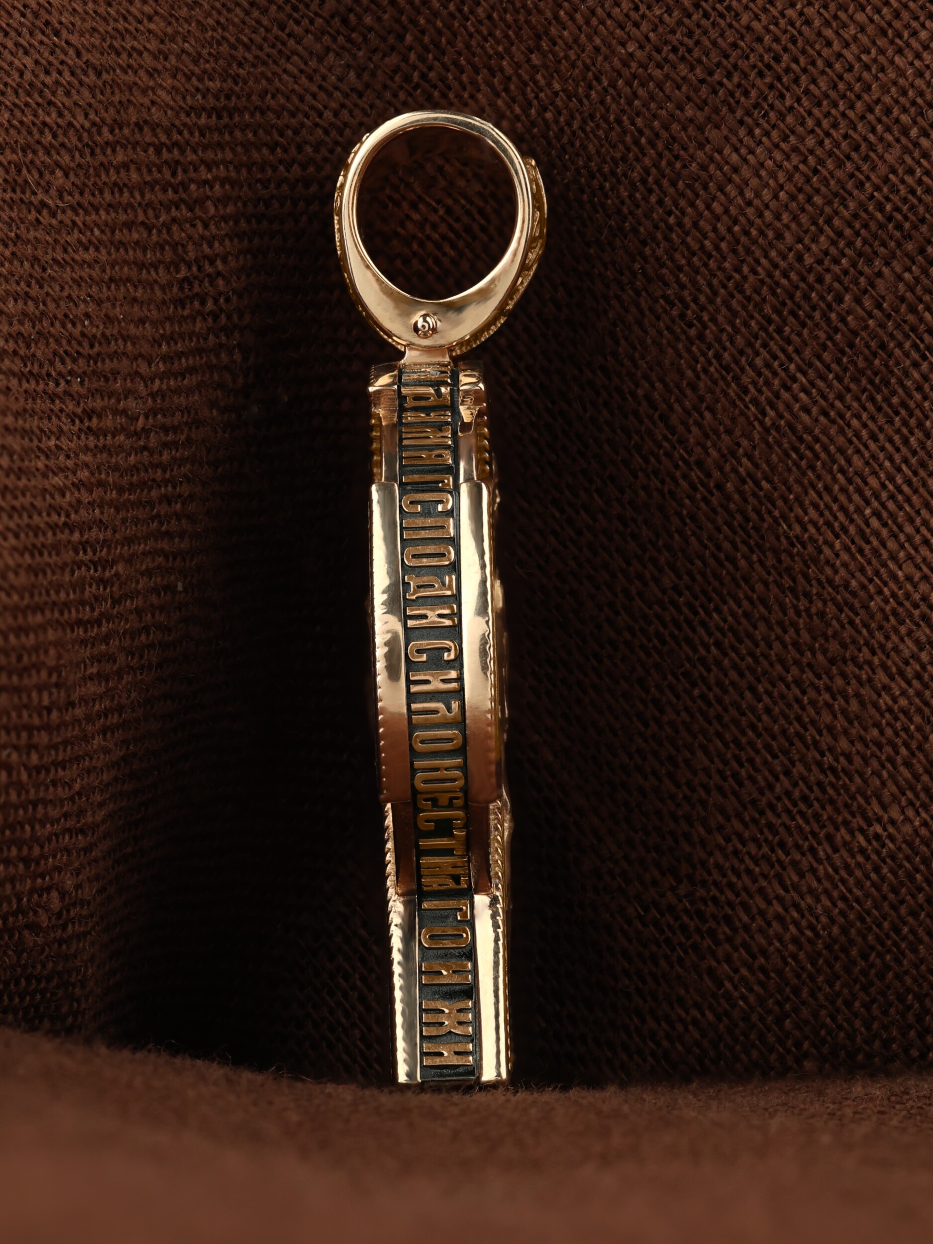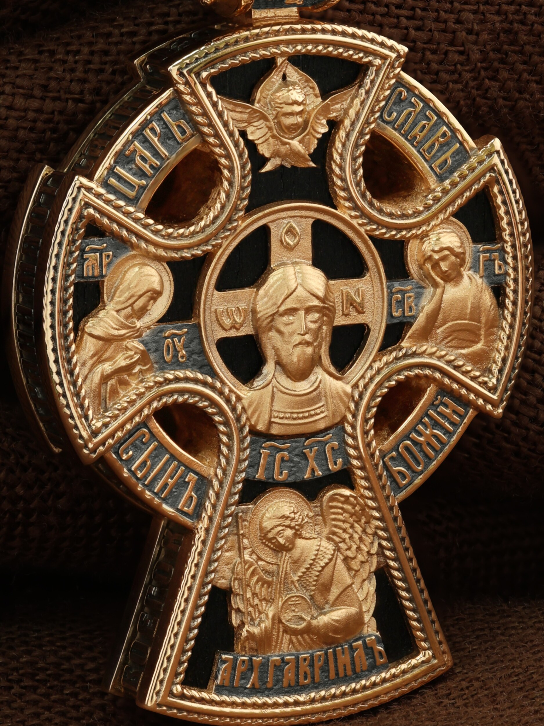 Крест объединяет в одной фигуре два христианских символа — круг-нимб и крест. Крест подобной формы был распространён в Новгородских землях в XIII—XVI веках. В центре лицевой стороны креста размещен образ Господа и Спасителя нашего Иисуса Христа — Господь Вседержитель или Пантократор (от греч. всевластный, всесильный). Именование Иисуса «Вседержителем» указывает, с одной стороны, на Его Божественную природу: «Аз есмь Альфа и Омега, начало и конец, говорит Господь, Который есть и был и грядет, Вседержитель» (Откр. 1: 8). С другой стороны, такое именование связано и с человеческой природой Христа, искупившего крестной жертвой людские грехи и обновившего тем самым человеческую природу. Крест сопровождается каноническими надписями: «Царь Славы» и «Сын Божий», что означает божественную природу Иисуса Христа, которые размещены по кругу. Слева от образа помещен лик Пречистой Богородицы, скорой помощницы и заступницы рода Христианского. Справа изображен апостол и евангелист Иоанн Богослов, один из ближайших учеников Иисуса Христа. Выше образа размещено изображение шестикрылого Серафима, ниже — Ар¬хан¬гела Гав¬ри¬ила. На кулонном кольце помещено изображение Креста «Голгофа», на котором был распят Господь и Спаситель наш Иисус Христос.