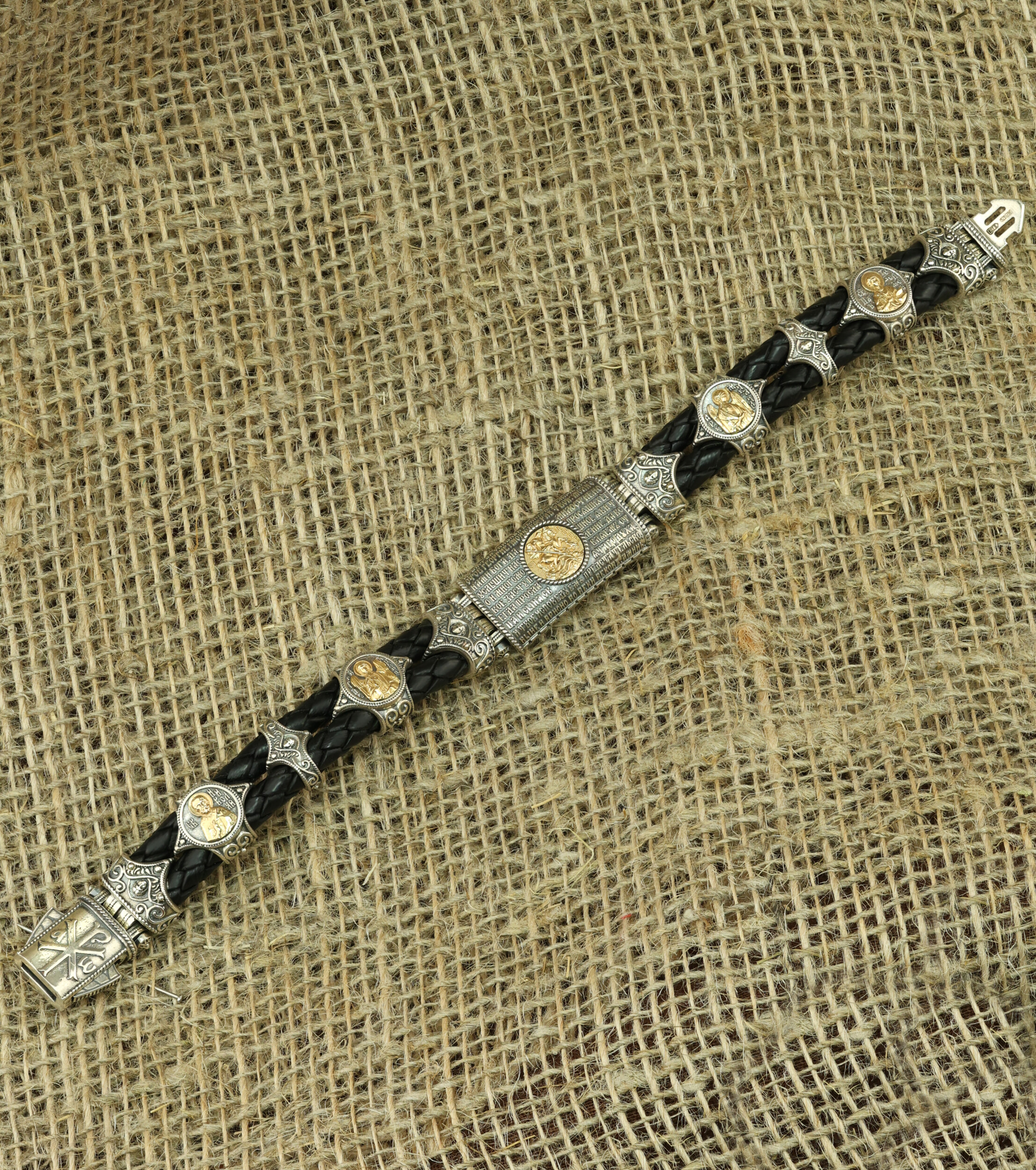 Браслет из серебра и золота c кожаным шнурком