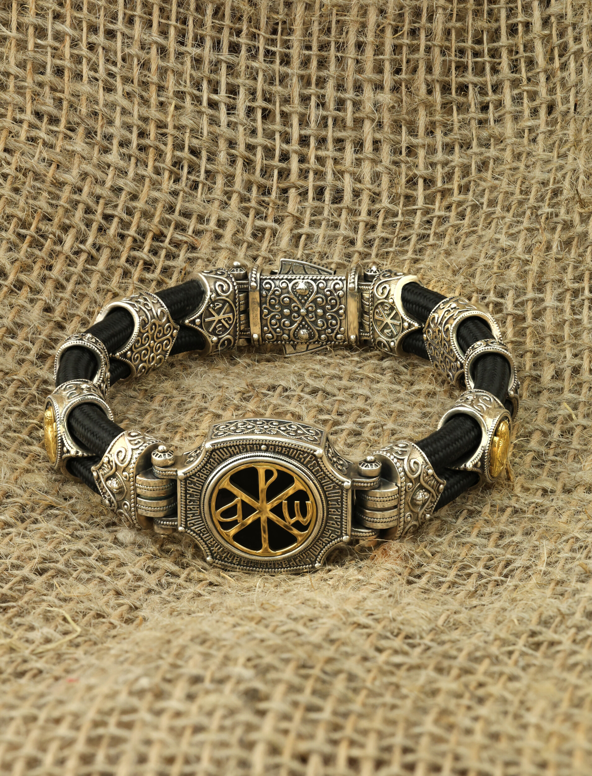 Браслет из серебра и золота c ониксом и шёлковым шнурком