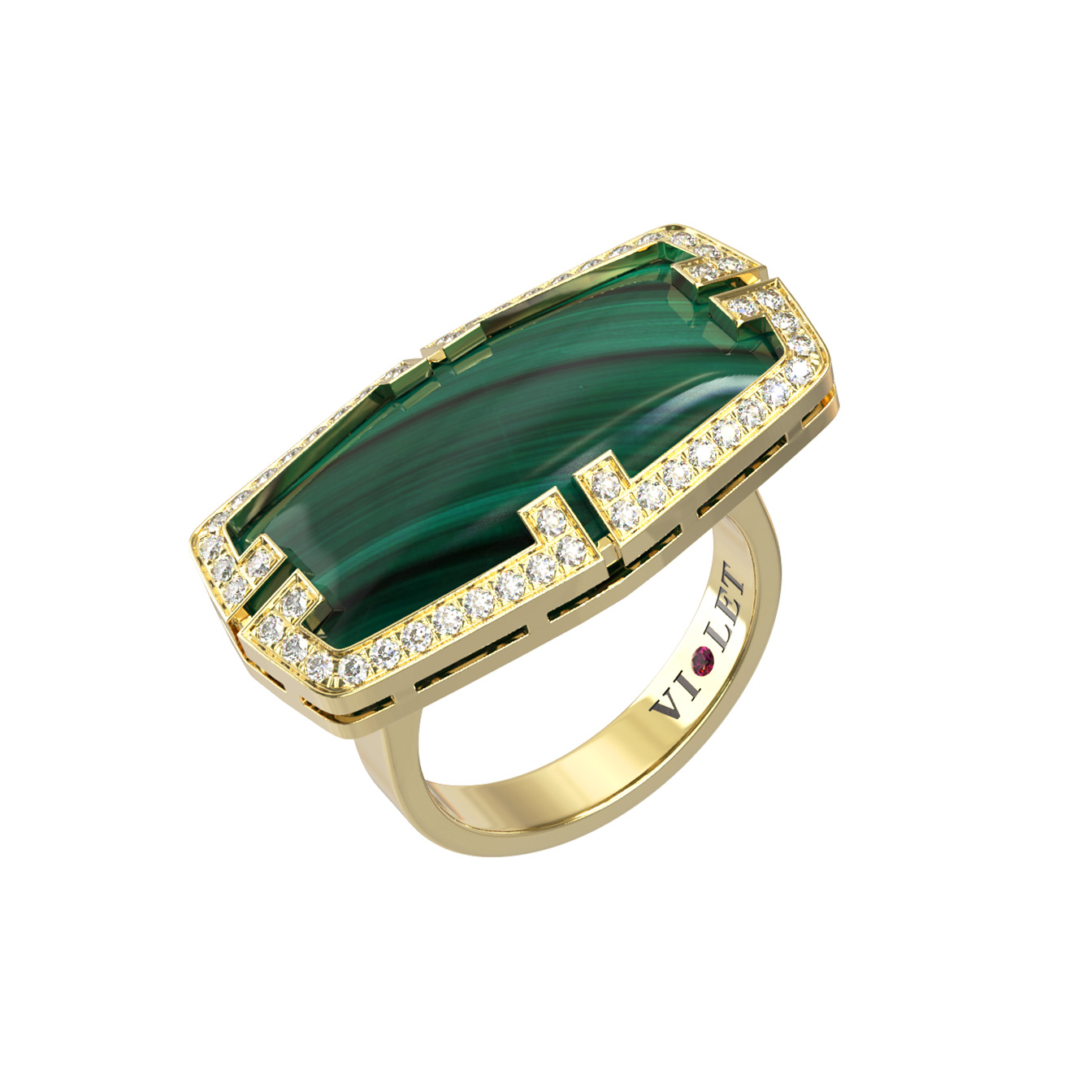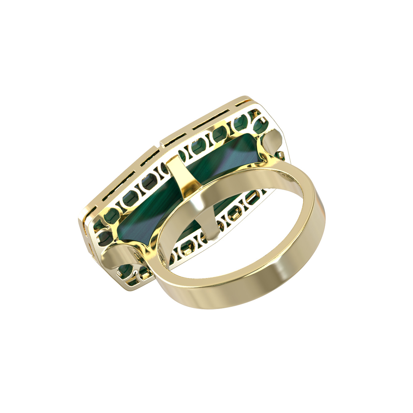 Кольцо из лимонного золота c бриллиантами, рубином и малахитом