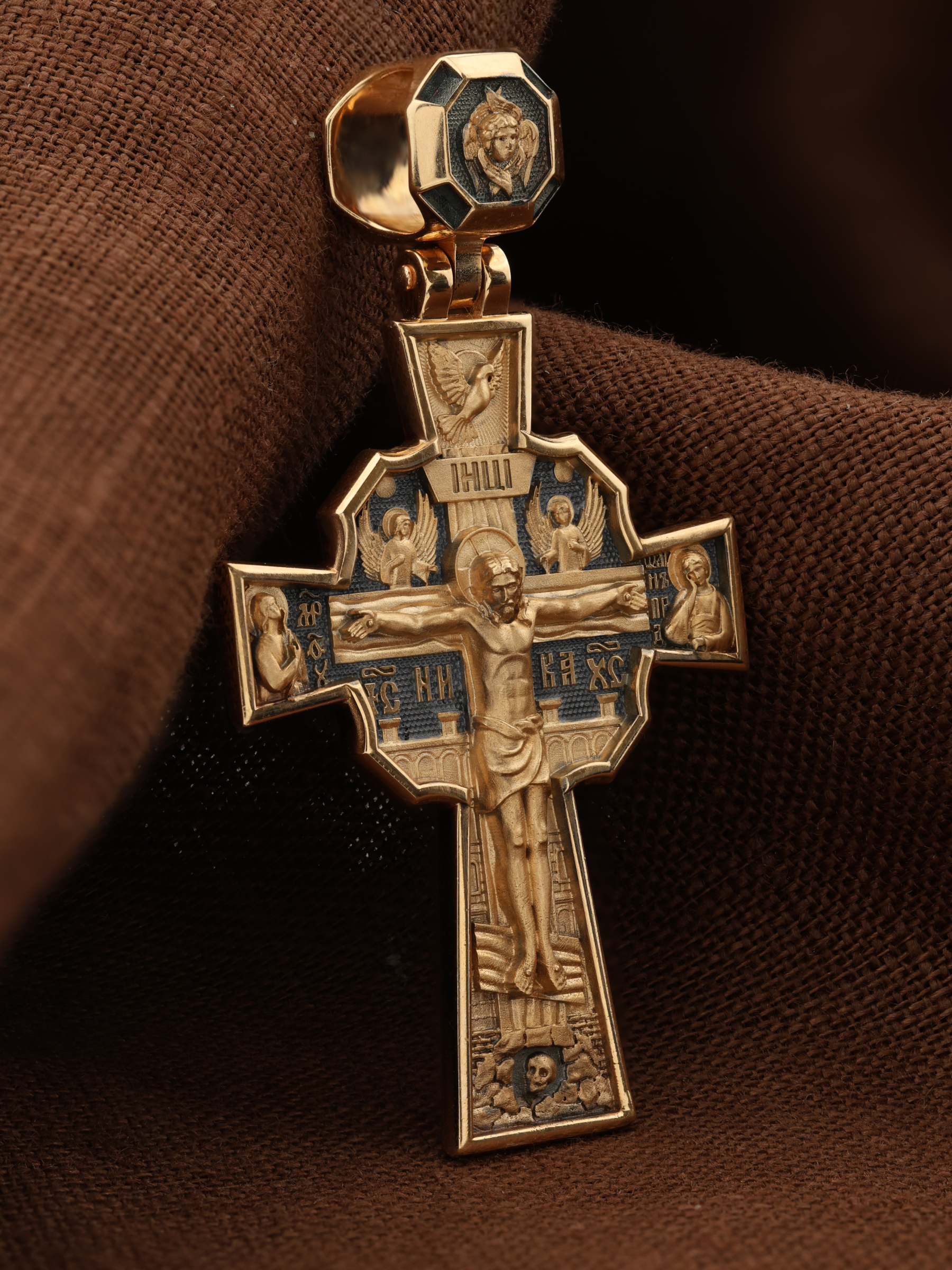 Над Распятием изображен парящий голубь — символ Святого Духа и Его благодати. На кулонном кольце изображен шестикрылый Серафим — самый приближенный к Господу Ангел.