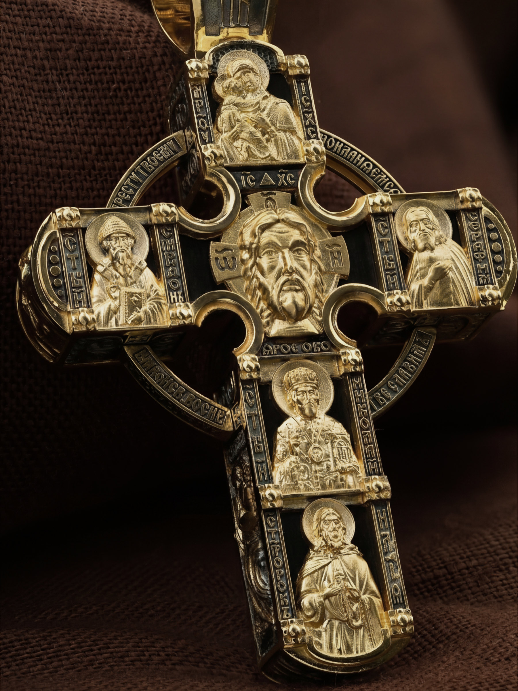 Крест объединяет в одной фигуре два христианских символа — круг-нимб и крест. На лицевой стороне креста изображено Распятие Господа и Спасителя нашего Иисуса Христа. Крест — символ спасения и искупления рода человеческого, знамение победы над смертью и адом. Распятие сопровождается каноническими надписями. На верхней табличке, выше головы Иисуса, расположена надпись, составленная Понтием Пилатом — «IНЦI». Она означает «Иисус Назорей, Царь Иудейский». Надписи «IC» «ХC», что означает Иисус Христос и «Сын Божий» размещается на разных сторонах поперечной перекладины креста. Вдоль Распятия размещены надписи «Царь Славы», «НИКА» (греч. — Победитель) и «МЛРБ» — «место лобное рай бысть» означает место лобное стало раем». Крест стоит на горе камней, символизирующих Голгофу. В ее основании различается череп — это голова Адама. Вдоль креста изображены орудия Страстей Христовых: копие сотника Лонгина, которым пронзили подреберье мёртвого Иисуса, чтобы убедиться в Его смерти, и трость с губкой, с которой Иисуса напоили уксусом. Они обозначены буквами «К» и «Т». Слева от Распятия помещены лики Пречистой Богородицы и Апостола Петра, справа изображены Апостол и евангелист Иоанн Богослов и Апостол Павел. Над Распятием изображен Святой Ангел-Хранитель, ниже — икона Божией Матери «Семистрельная». По кругу размещена молитва: «Кресту Твоему поклоняемся, Владыко, и Святое Воскресение Твое славим». На кулонном кольце помещено изображение Креста «Голгофа», на котором был распят Господь и Спаситель наш Иисус Христос.