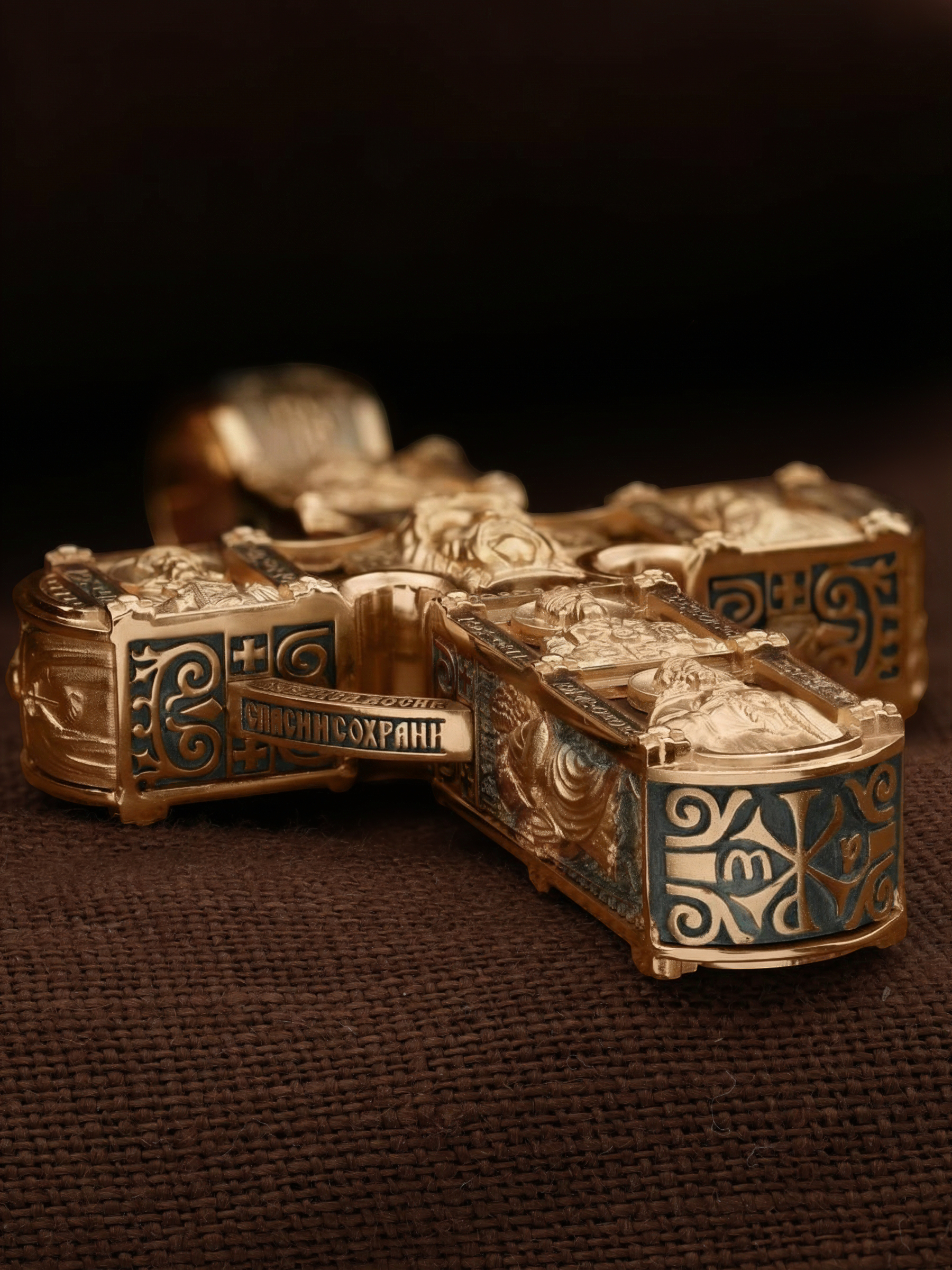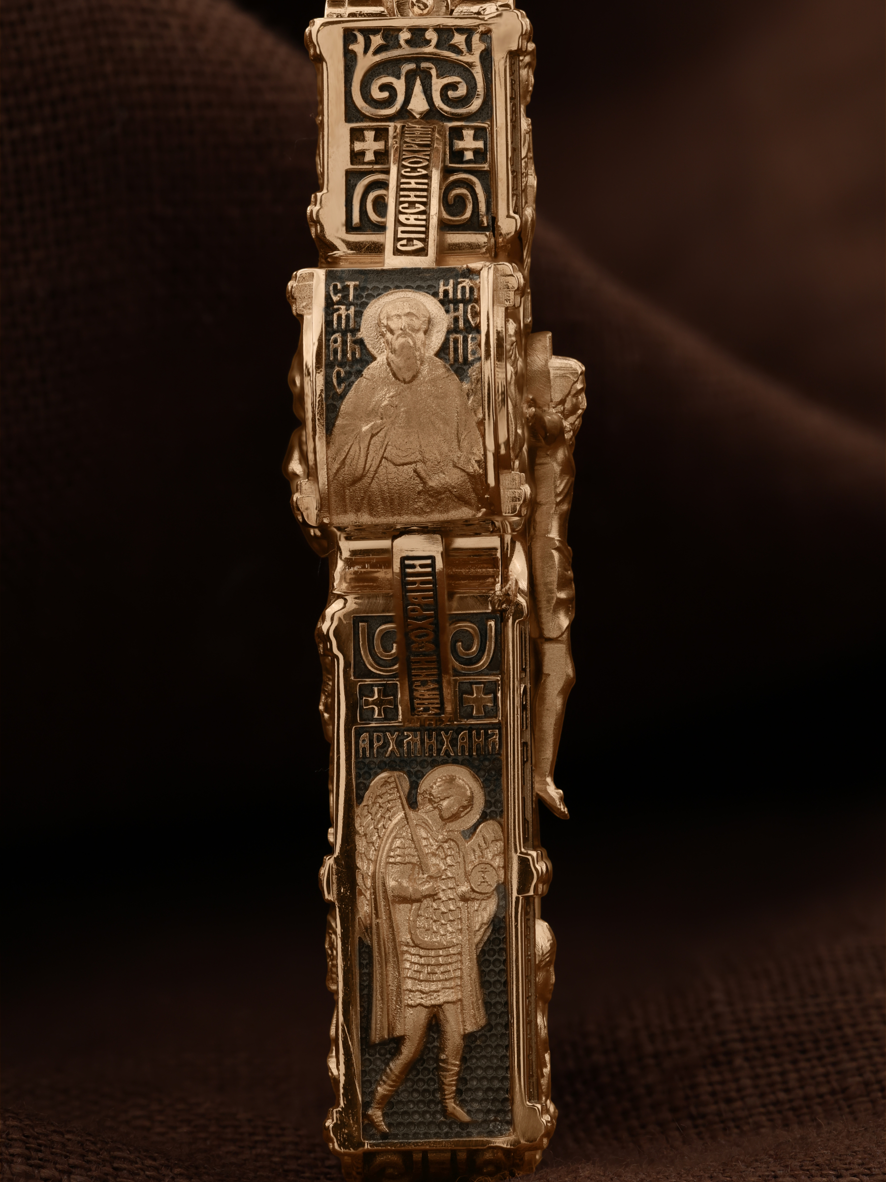 Крест объединяет в одной фигуре два христианских символа — круг-нимб и крест. На лицевой стороне креста изображено Распятие Господа и Спасителя нашего Иисуса Христа. Крест — символ спасения и искупления рода человеческого, знамение победы над смертью и адом. Распятие сопровождается каноническими надписями. На верхней табличке, выше головы Иисуса, расположена надпись, составленная Понтием Пилатом — «IНЦI». Она означает «Иисус Назорей, Царь Иудейский». Надписи «IC» «ХC», что означает Иисус Христос и «Сын Божий» размещается на разных сторонах поперечной перекладины креста. Вдоль Распятия размещены надписи «Царь Славы», «НИКА» (греч. — Победитель) и «МЛРБ» — «место лобное рай бысть» означает место лобное стало раем». Крест стоит на горе камней, символизирующих Голгофу. В ее основании различается череп — это голова Адама. Вдоль креста изображены орудия Страстей Христовых: копие сотника Лонгина, которым пронзили подреберье мёртвого Иисуса, чтобы убедиться в Его смерти, и трость с губкой, с которой Иисуса напоили уксусом. Они обозначены буквами «К» и «Т». Слева от Распятия помещены лики Пречистой Богородицы и Апостола Петра, справа изображены Апостол и евангелист Иоанн Богослов и Апостол Павел. Над Распятием изображен Святой Ангел-Хранитель, ниже — икона Божией Матери «Семистрельная». По кругу размещена молитва: «Кресту Твоему поклоняемся, Владыко, и Святое Воскресение Твое славим». На кулонном кольце помещено изображение Креста «Голгофа», на котором был распят Господь и Спаситель наш Иисус Христос.