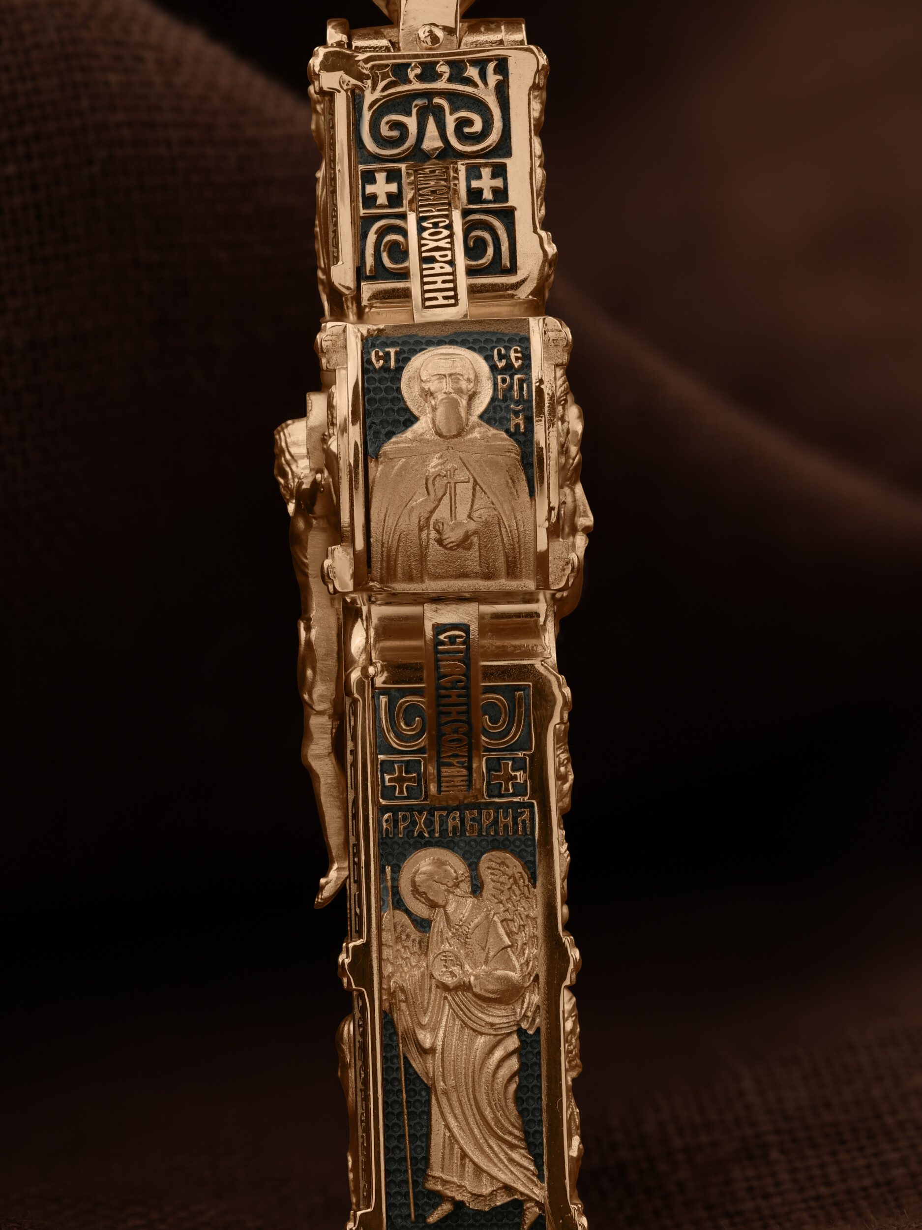 В центре оборотной стороны креста размещен образ Господа и Спасителя нашего Иисуса Христа  — Господь Вседержитель или Пантократор (от греч. всевластный, всесильный). Именование Иисуса «Вседержителем» указывает, с одной стороны, на Его Божественную природу: «Аз есмь Альфа и Омега, начало и конец, говорит Господь, Который есть и был и грядет, Вседержитель» (Откр. 1: 8). С другой стороны, такое именование связано и с человеческой природой Христа, искупившего крестной жертвой людские грехи и обновившего тем самым человеческую природу. Над образом изображена икона Божией Матери «Владимирская», ниже — образы святителя Николая Чудотвореца, архиепископа Мир Ликийских и пророка Ильи. Слева изображен святитель Спиридон Тримифунтский, справа — преподобный Серафим Саровский. На кулонном кольце размещен образ шестикрылого Серафима.