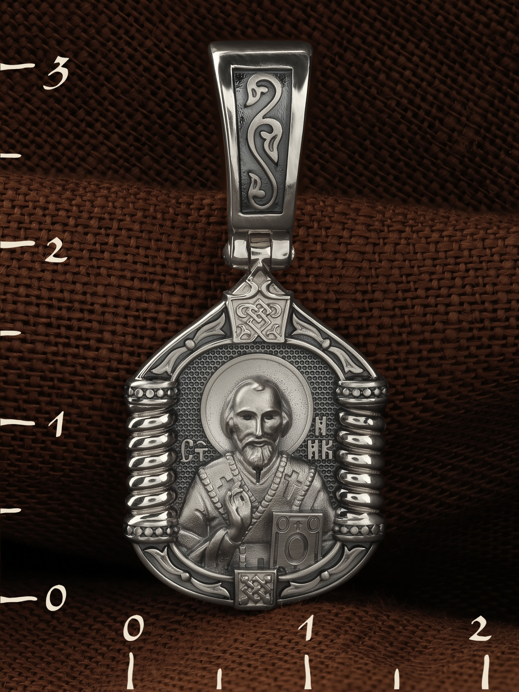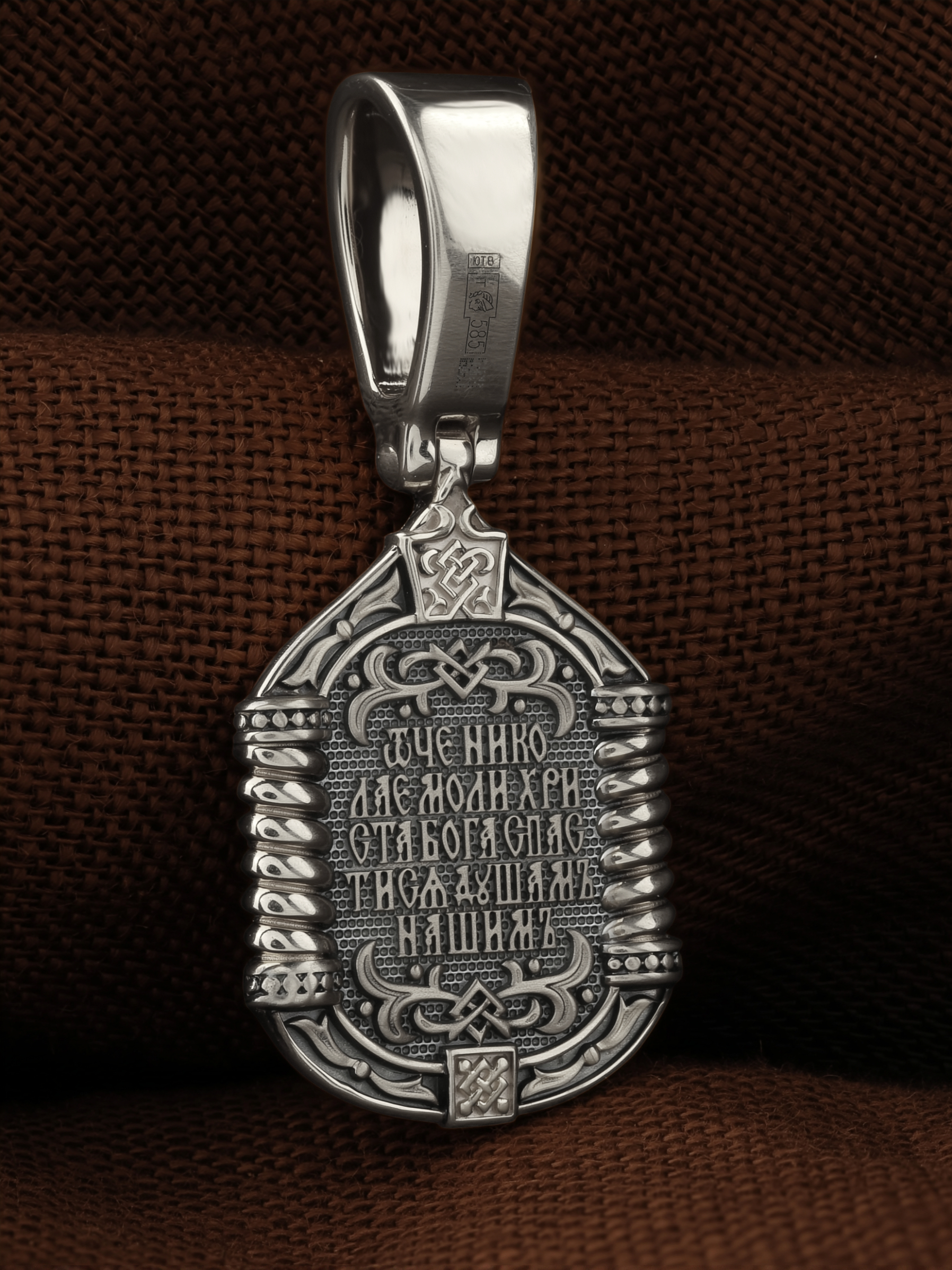 На лицевой стороне образка изображен Святитель Николай архиепископ Мир Ликийских, Чудотворец. Он является одним из самых почитаемых святых в православном мире. Святитель Николай родился во второй половине III века в Малой Азии в Ликийском городе Патары. С рождения Божий Угодник проявлял необыкновенные дарования. Сохранилось Предание, что во время крещения он, никем не поддерживаемый, простоял в купели три часа. Приняв сан священника, святитель Николай стал проводить еще более строгую подвижническую жизнь. Избранник Божий Николай стал вершиной всех добродетелей, поднятой до райской высоты. С кем из величайших праведников не сравнялся он образом духов­ной красоты, кому из них не последовал в своих деяниях и чудотворениях? Вся жизнь святого Николая — это служение Богу. Много великих и преславных чудес сотворил великий Святитель Николай Угодник. Он помогал сущим в бедах, укрощал штормы, спасал от потопления и выносил на сушу из глубины морской, освобождал из плена и приносил освобожденных домой, избавлял от уз и темницы, защищал от посечения мечом, освобождал от смерти и подавал многим различные исцеления, слепым прозрение, хромым хождение, глухим слух, немым дар слова.