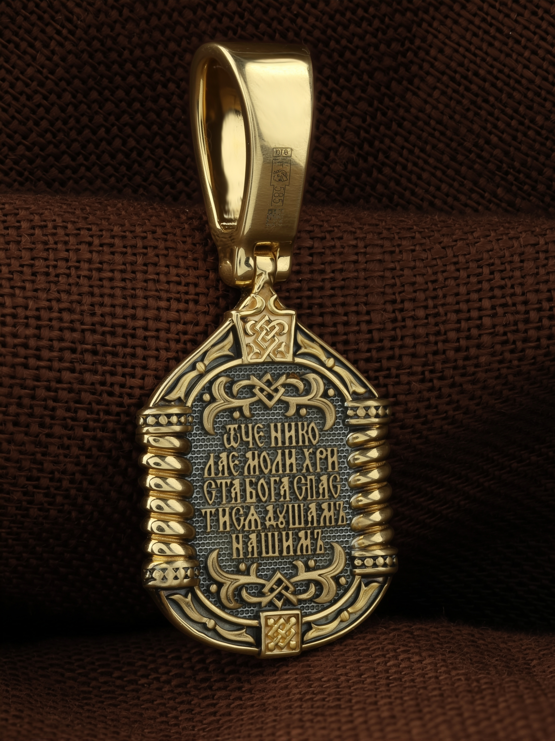 На лицевой стороне образка изображен Святитель Николай архиепископ Мир Ликийских, Чудотворец. Он является одним из самых почитаемых святых в православном мире. Святитель Николай родился во второй половине III века в Малой Азии в Ликийском городе Патары. С рождения Божий Угодник проявлял необыкновенные дарования. Сохранилось Предание, что во время крещения он, никем не поддерживаемый, простоял в купели три часа. Приняв сан священника, святитель Николай стал проводить еще более строгую подвижническую жизнь. Избранник Божий Николай стал вершиной всех добродетелей, поднятой до райской высоты. С кем из величайших праведников не сравнялся он образом духовной красоты, кому из них не последовал в своих деяниях и чудотворениях? Вся жизнь святого Николая — это служение Богу. Много великих и преславных чудес сотворил великий Святитель Николай Угодник. Он помогал сущим в бедах, укрощал штормы, спасал от потопления и выносил на сушу из глубины морской, освобождал из плена и приносил освобожденных домой, избавлял от уз и темницы, защищал от посечения мечом, освобождал от смерти и подавал многим различные исцеления, слепым прозрение, хромым хождение, глухим слух, немым дар слова.