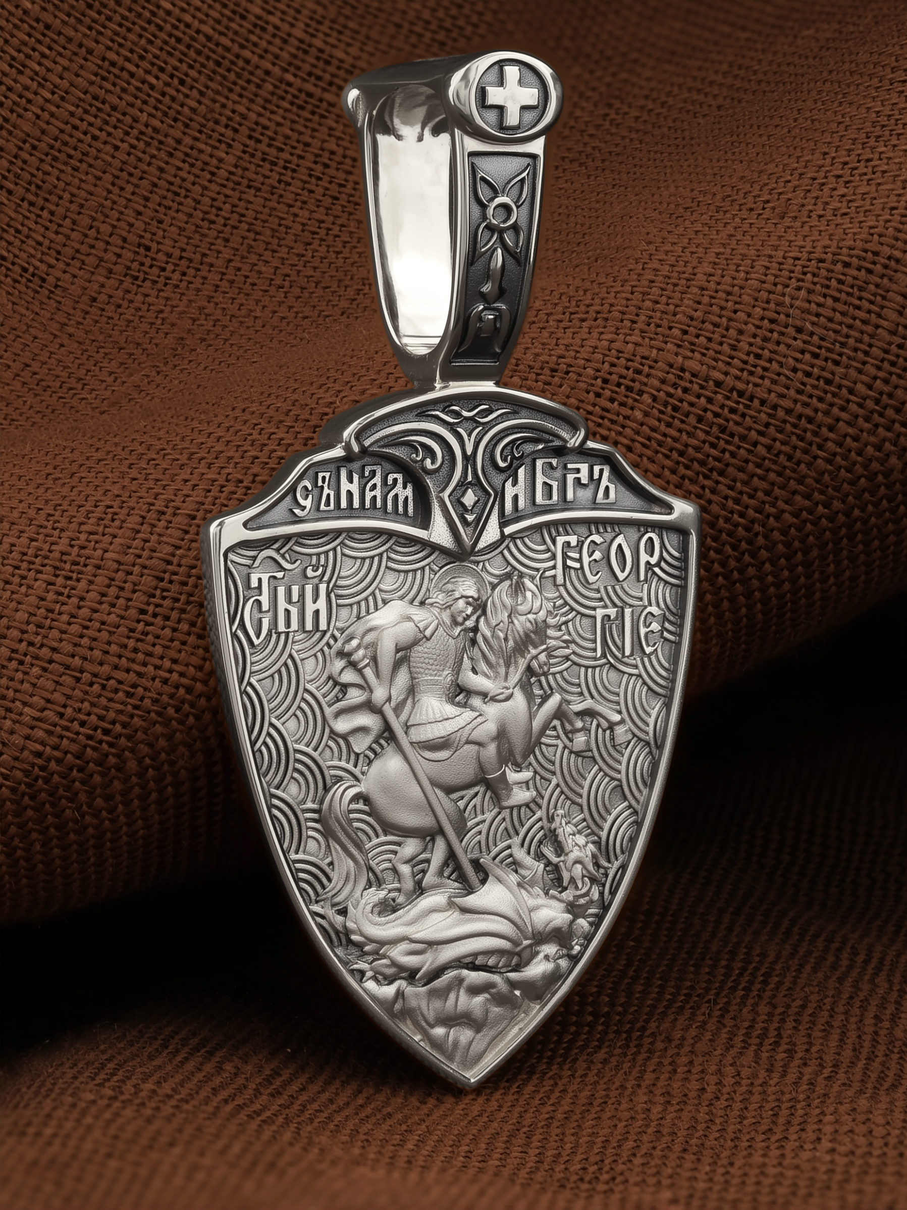 На оборотной стороне образка изображен Святой Великомученик Георгий Победоносец — один из самых почитаемых и удивительных святых. На Руси он известен как Юрий или Егорий, заступник для верующих, чья жизнь имеет какое-либо отношение к военным делам, помощник в крестьянском труде. На образке Георгий изображен как воитель, сидящий на вздыбленном коне и поражающий копьем огнедышащего змея. Змей символизирует собою сатанинские силы. Молитвами вознесенными к Всевышнему и своей непреклонной верой он смог одолеть чудовище. Святой убил змея, спас царскую дочь, принесенную в жертву, и жителей города, их души от влияния дьявола, породив в них надежду и веру в Господа, призывая людей принять христианскую веру.