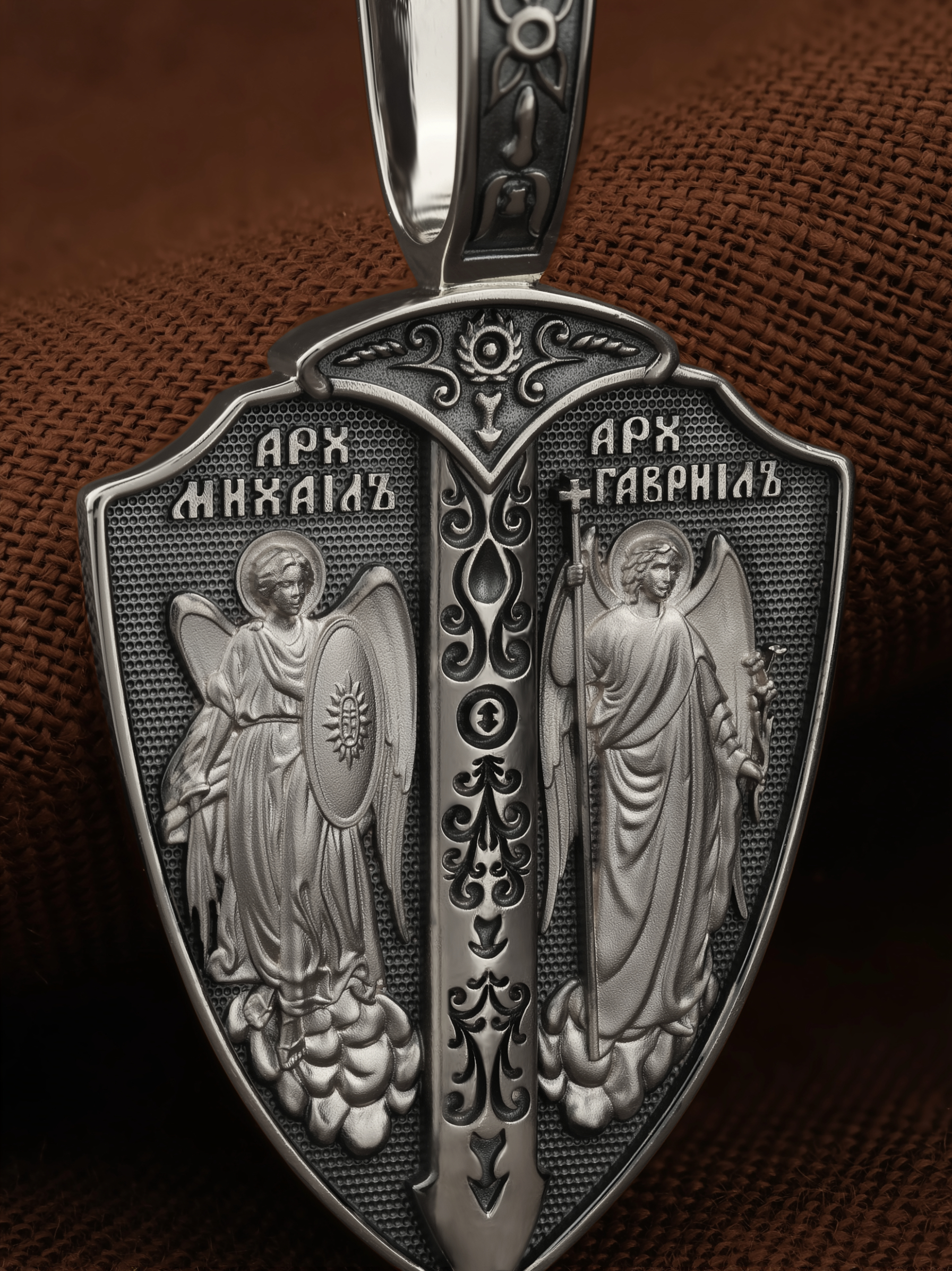 Образок выполнен в виде воинского щита и меча. На лицевой стороне образка изображены Архангел Михаил и Архангел Гавриил. Архангел Михаил изображен в воинственном виде с огненным мечом в правой руке и щитом в левой руке. Архангел Михаил — верный служитель Божий, который низринул с Неба возгордившегося денницу с другими павшими духами. В Православии его называют Архистратигом, что означает глава святого воинства Ангелов и Архангелов. Архангел почитается как покровитель воинов и всех верных Богу и ведущих борьбу против сил зла, борец против ересей, а также защитник душ умерших, страж райских врат. Архангел Гавриил изображен с крестом в правой руке и цветком лилии в левой руке. Он несколько раз упоминается в Писании, как Небесный вестник, которого Бог посылает, чтобы возвестить людям Свои планы о спасении рода человеческого. Так, Архангел Гавриил несколько раз являлся пророку Даниилу и раскрывал ему тайны пришествия Мессии, гонений антихриста и конца мира (Дан. 8, 16, 9−21). Перед пришествием Сына Божия в мир архангел Гавриил явился в храме старцу Захарии и сообщил ему о чудесном зачатии Предтечи. Через шесть месяцев он явился в Назарете Деве Марии с вестью об избрании Ее быть Матерью Христа Спасителя (Лк. 1). Когда Господь перед Своими страданиями молился в Гефсиманском саду до кровавого пота, на укрепление Его, по Церковному Преданию, был послан с Небес Архангел Гавриил. (Лк.22:43). Жены мироносицы услышали от Архистратига радостную весть о Воскресении Христовом.