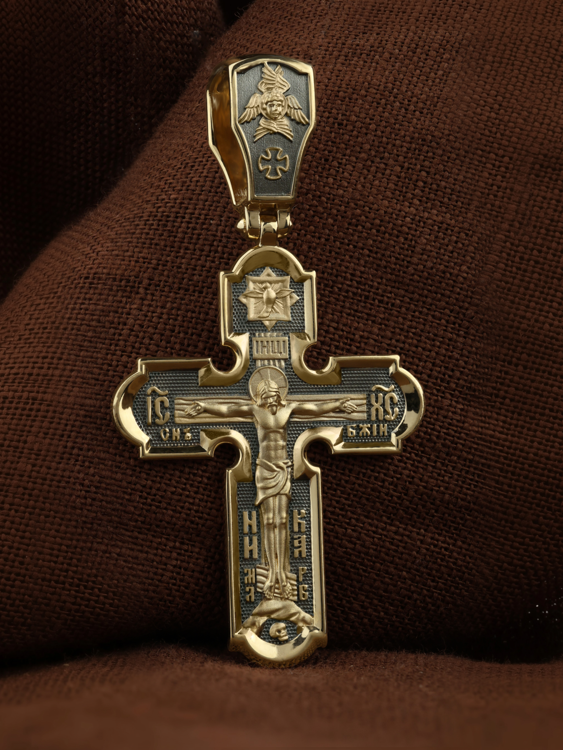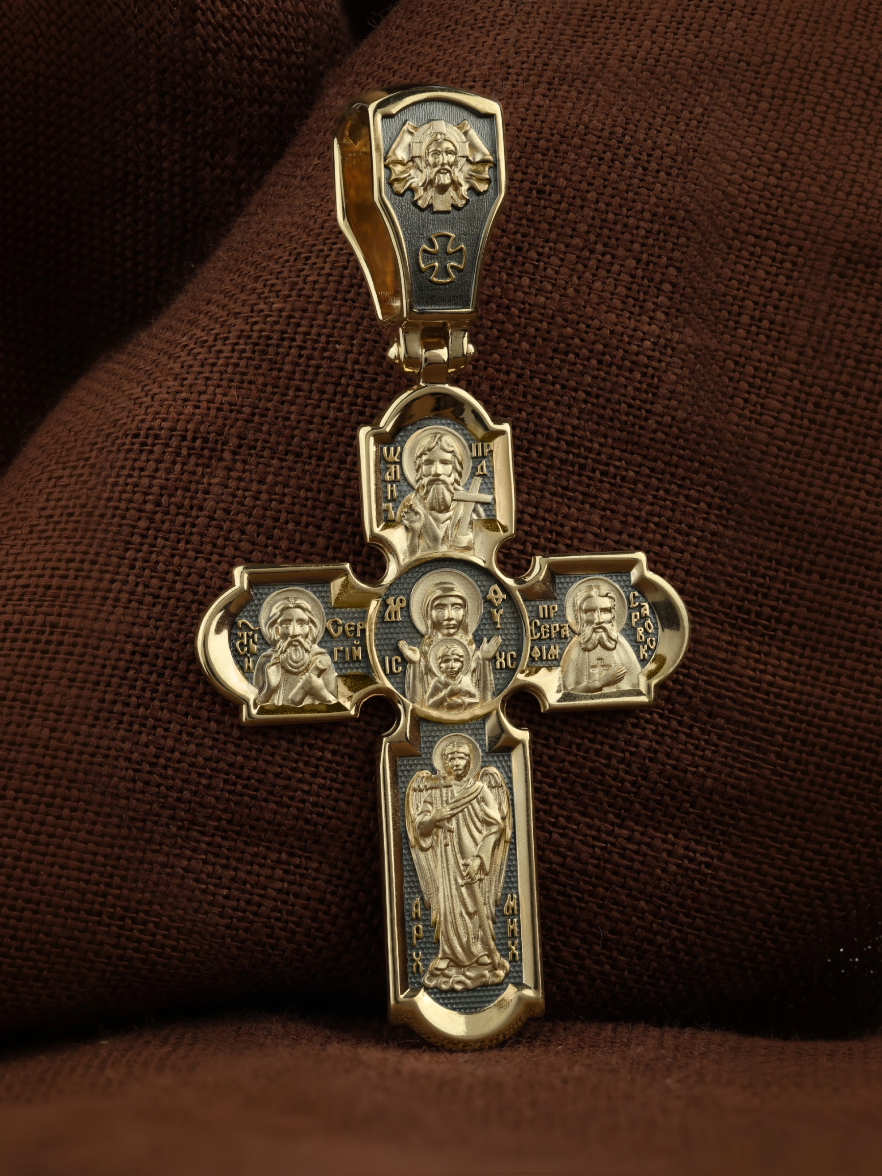 На кресте внизу изображен Ангел Хранитель, слева — Святая Блаженная Ксения, справа — Святая Блаженная Матрона, вверху — пророк, почитающийся в христианстве, Предтеча Господень Иоанн Креститель. На кулонном кольце помещено изображение Спаса Нерукотворного — образ Спасителя, который Он запечатлел на плате и передал для исцеления больному проказой царю Эдессы. Ему придается победное и защитное значение.