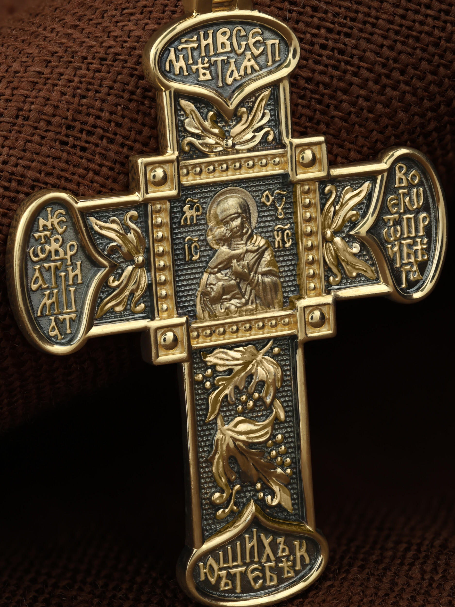 В центре оборотной стороне креста помещен образ Владимирской иконы Божией Матери — один из самых чтимых святынь Русской православной церкви. По преданию, икона была написана Святым апостолом и евангелистом Лукой во время земной жизни Богородицы. Дева Мария, увидев Свое изображение, молвила: «Отныне ублажат Мя вси роди. Благодать Рождшегося от Меня и Моя с сим образом да будет». Образ написан в лирическом иконографическом типе «Умиление». Младенец припал щекой к щеке Матери и тянется к ней правой рукой, другой нежно обнимая за шею. Икона Владимирской Божией Матери вплоть до V века находилась в Иерусалиме, затем была перевезена в Византию. На Русь икона была привезена в 1131 г. За прошедшие столетия святыня неоднократно переезжала из Владимира в Москву и обратно, не раз спасая страну от захватчиков. Русская Православная Церковь установила троекратное празднование Владимирской иконе Божией Матери. Каждый из дней празднования связан с избавлением русского народа от порабощения иноплеменниками по молитвам ко Пресвятой Богородице. В последующие века у иконы происходили многие важные исторические события: подписание актов, принятие присяги значимых государственных деятелей и возведение на престол. Вокруг образа, по сторонам Креста, написана молитва: «Мати Всепетая, не отврати лица Твоего от прибегающих к Тебе». Оборотная сторона креста украшена растительным орнаментом.