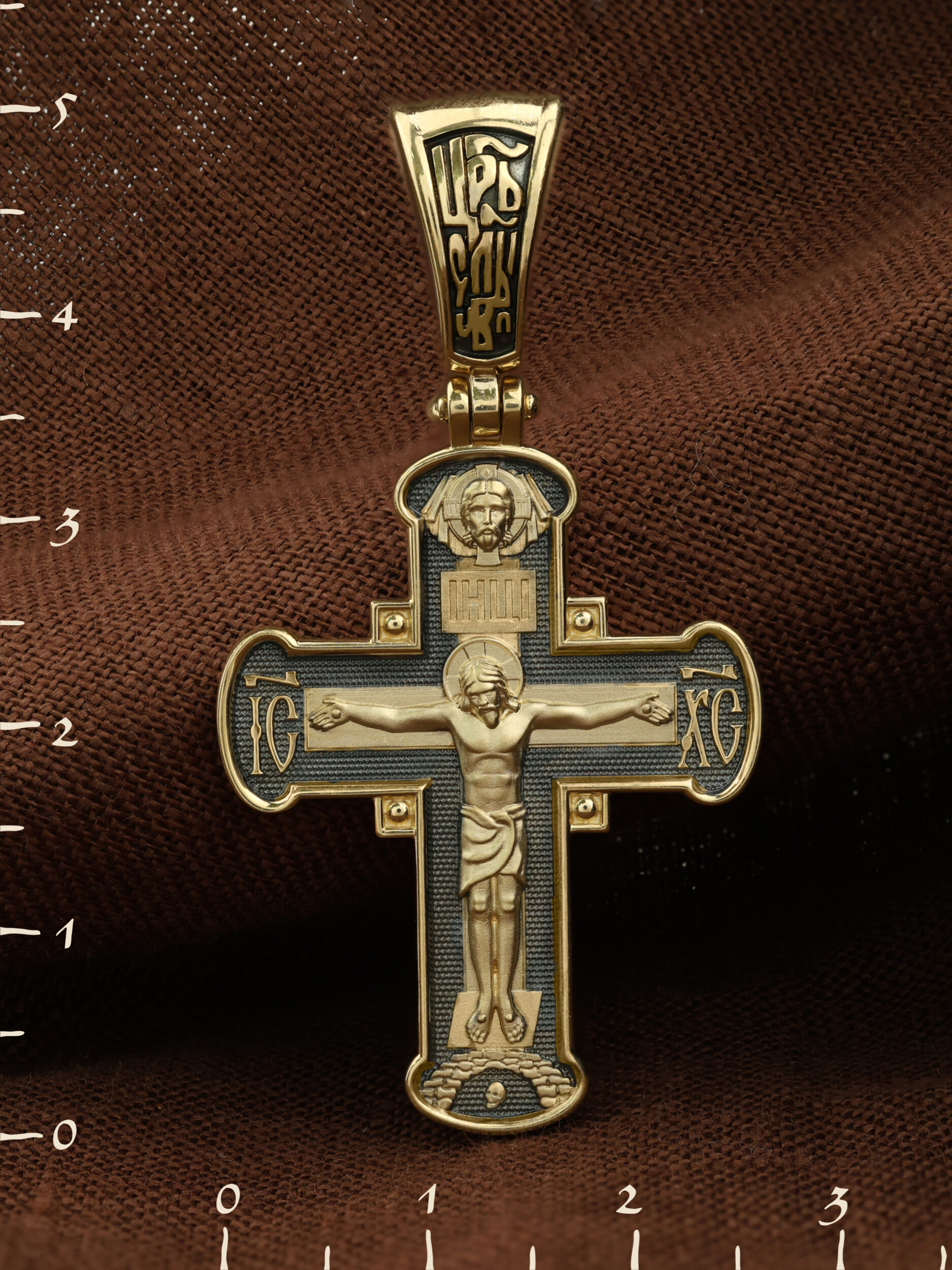 На лицевой стороне креста изображено Распятие Господа и Спасителя нашего Иисуса Христа, отдавшего Себя на смерть, для искупления грехов мира. Крест является символом жертвенной любви Всеблагого Бога к падшим людям, всепобеждающим духовным оружием христиан, основанием и средоточием церковной жизни. Господь сказал: «кто хочет идти за Мною, отвергнись себя, и возьми крест свой, и следуй за Мною». (Мк. 8: 34). На кулонном кольце помещена надпись «Царь Славы». На верхней табличке, выше головы Иисуса, расположена надпись, составленная Понтием Пилатом — «IНЦI». Она означает «Иисус Назорей, Царь Иудейский». Над ней — Нерукотворный образ Господа и Спасителя нашего Иисуса Христа, чудесно отпечатавшийся на плате, котором Христос вытер свой лик. Надпись «IC» «ХC», означает Иисус Христос, помещается на разных сторонах поперечной перекладины креста. Крест стоит на горе камней, символизирующих Голгофу. В ее основании различается череп– это голова Адама.