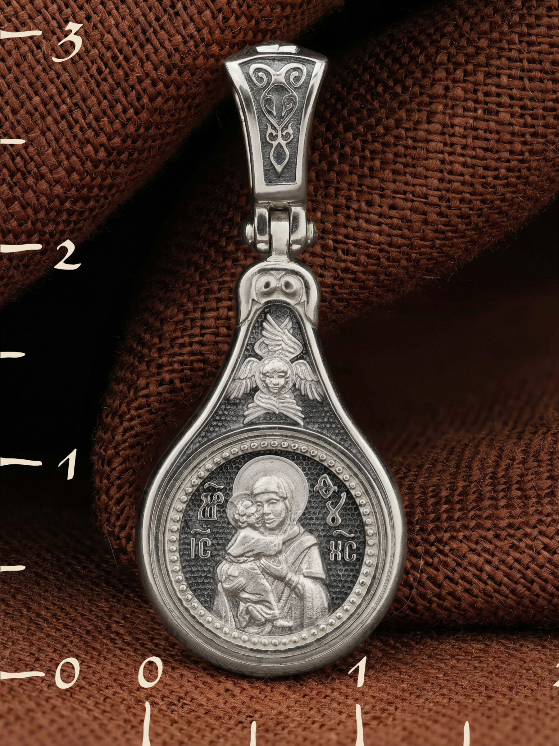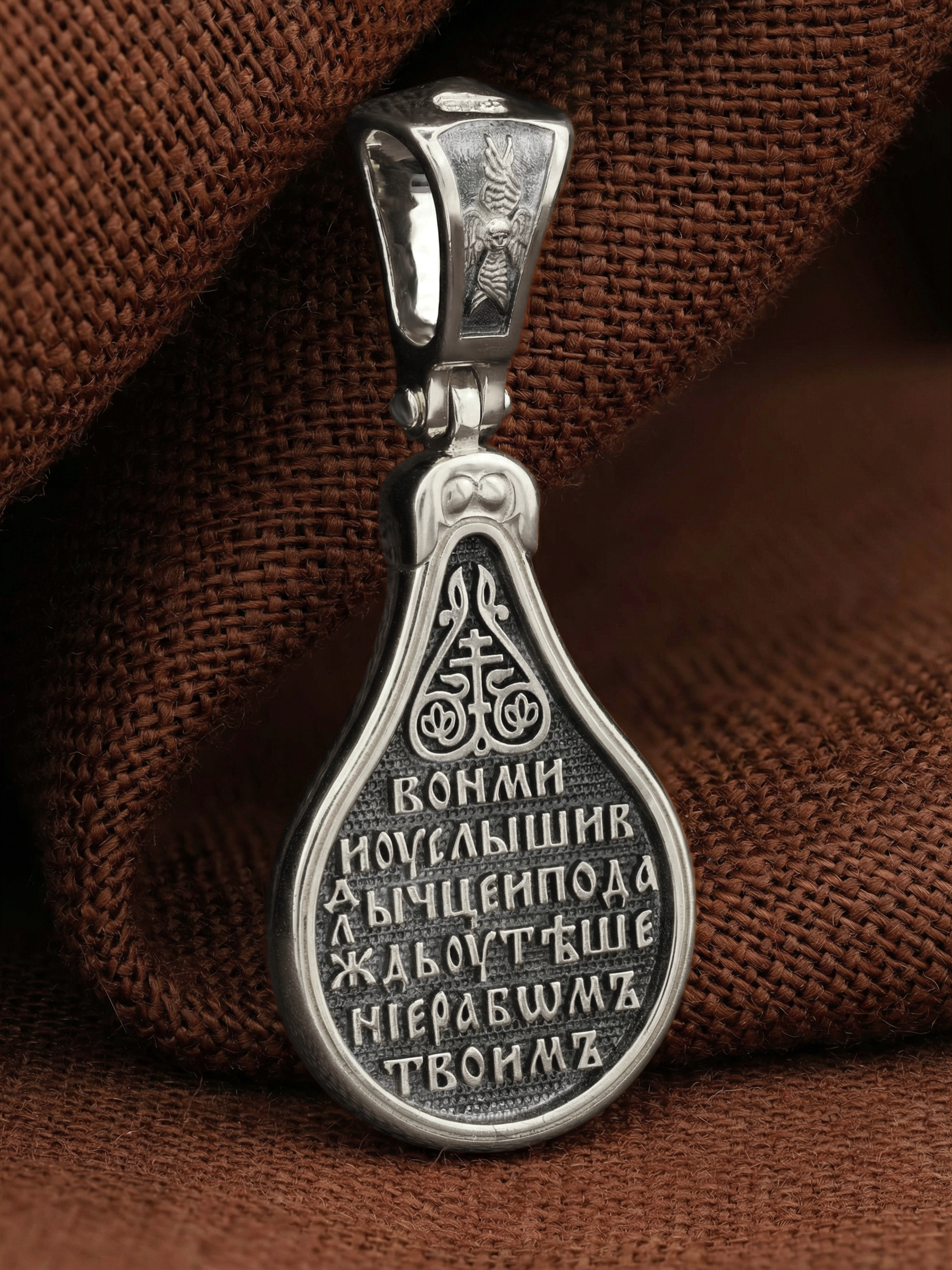 Лицевую сторону образка и кулонное кольцо украшает шестикрылый Серафим — самый приближенный к Господу Ангел.