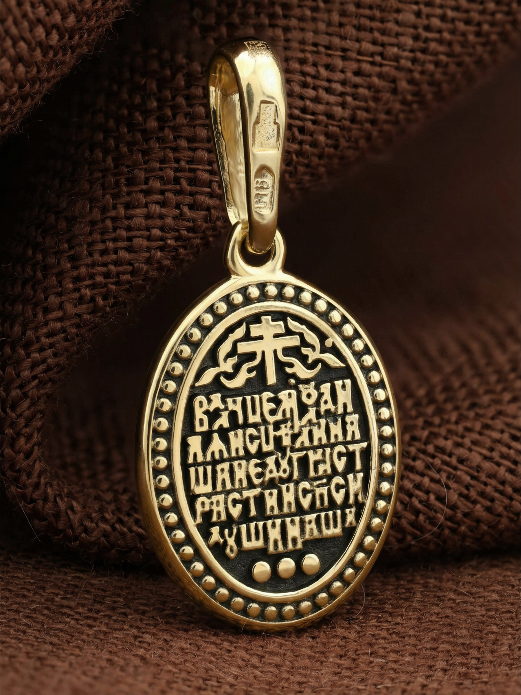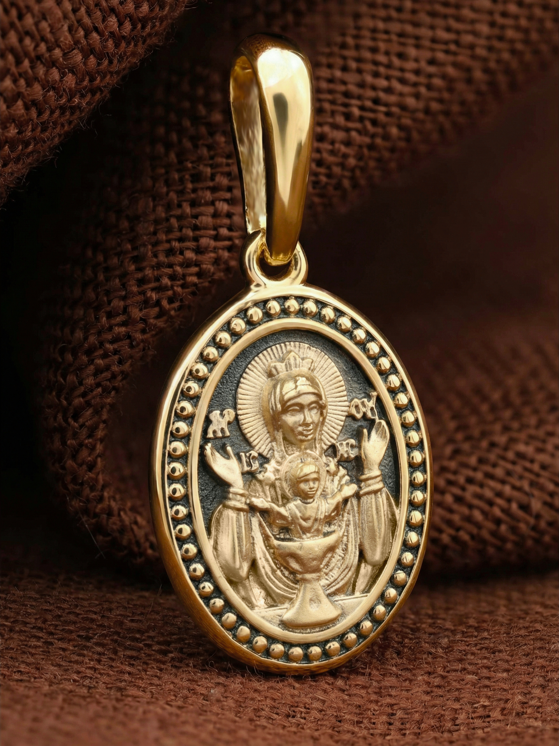 На лицевой части образка изображена икона Божией Матери «Неупиваемая чаша». Икона славится помощью в исцелении зависимостей, помогает людям обрести свободу от греховных страстей.