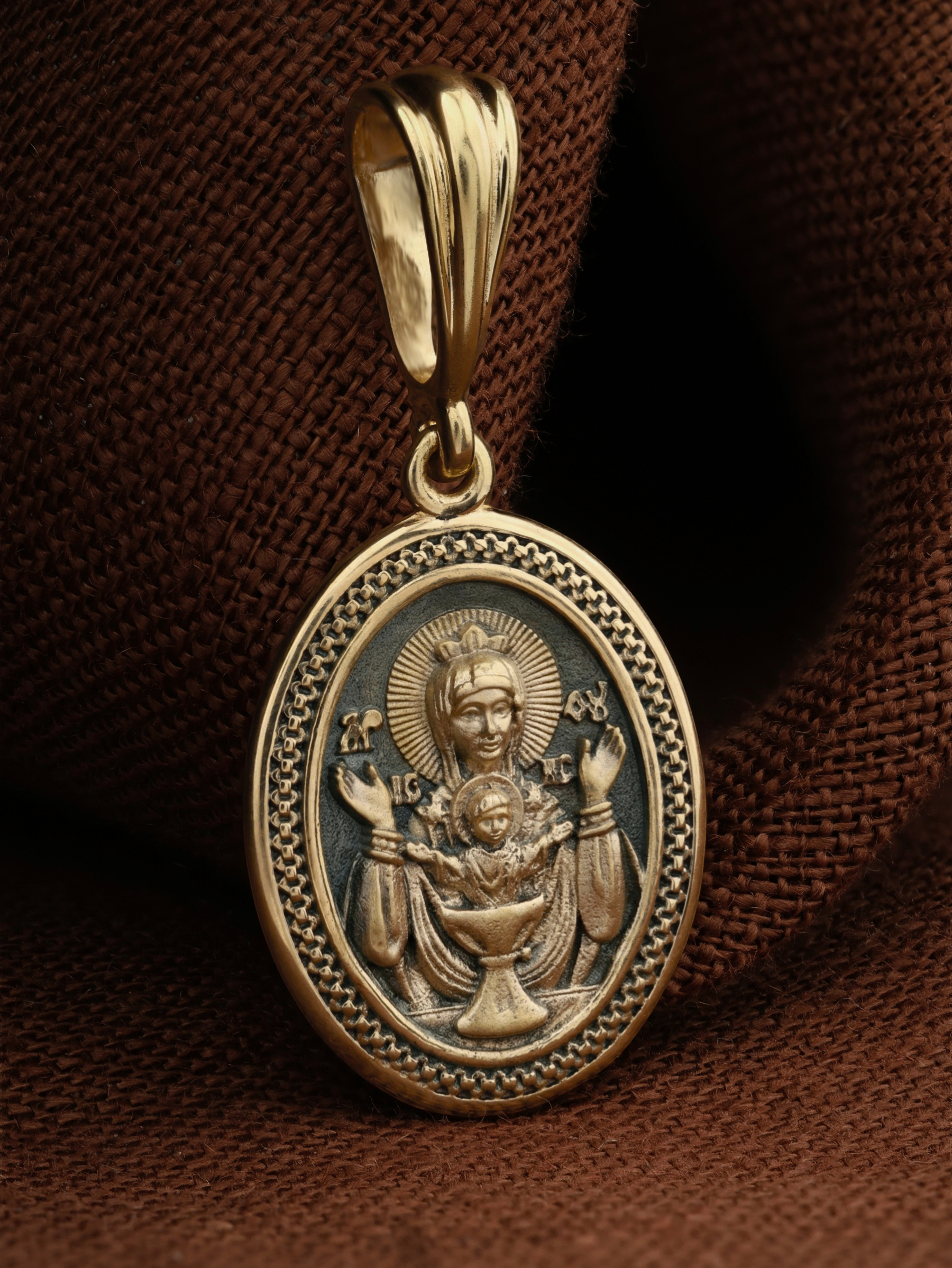 На лицевой части образка изображена икона Божией Матери «Неупиваемая чаша». Икона славится помощью в исцелении зависимостей, помогает людям обрести свободу от греховных страстей.