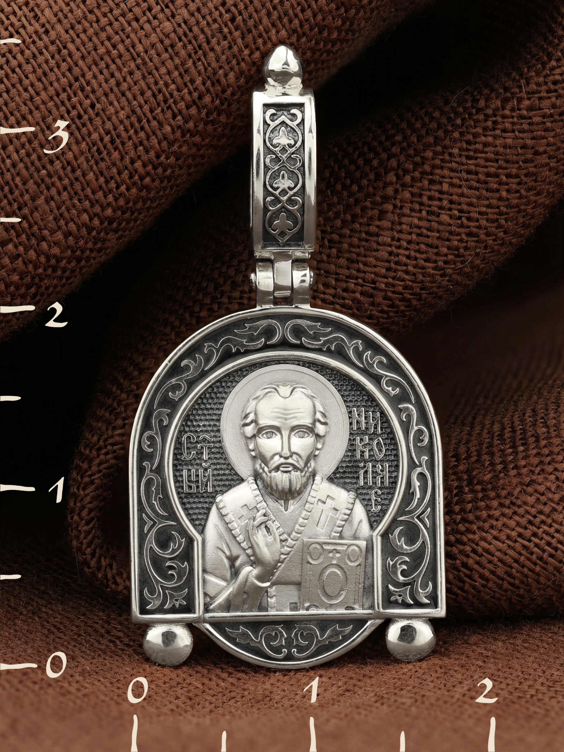 На лицевой стороне образка изображен Святитель Николай архиепископ Мир Ликийских, Чудотворец. Он является одним из самых почитаемых святых в православном мире. Святитель Николай родился во второй половине III века в Малой Азии в Ликийском городе Патары. С рождения Божий Угодник проявлял необыкновенные дарования. Сохранилось Предание, что во время крещения он, никем не поддерживаемый, простоял в купели три часа. Приняв сан священника, святитель Николай стал проводить еще более строгую подвижническую жизнь. Избранник Божий Николай стал вершиной всех добродетелей, поднятой до райской высоты. С кем из величайших праведников не сравнялся он образом духов­ной красоты, кому из них не последовал в своих деяниях и чудотворениях? Вся жизнь святого Николая — это служение Богу. Много великих и преславных чудес сотворил великий Святитель Николай Угодник. Он помогал сущим в бедах, укрощал штормы, спасал от потопления и выносил на сушу из глубины морской, освобождал из плена и приносил освобожденных домой, избавлял от уз и темницы, защищал от посечения мечом, освобождал от смерти и подавал многим различные исцеления: слепым — прозрение, хромым — хождение, глухим — слух, немым — дар слова.