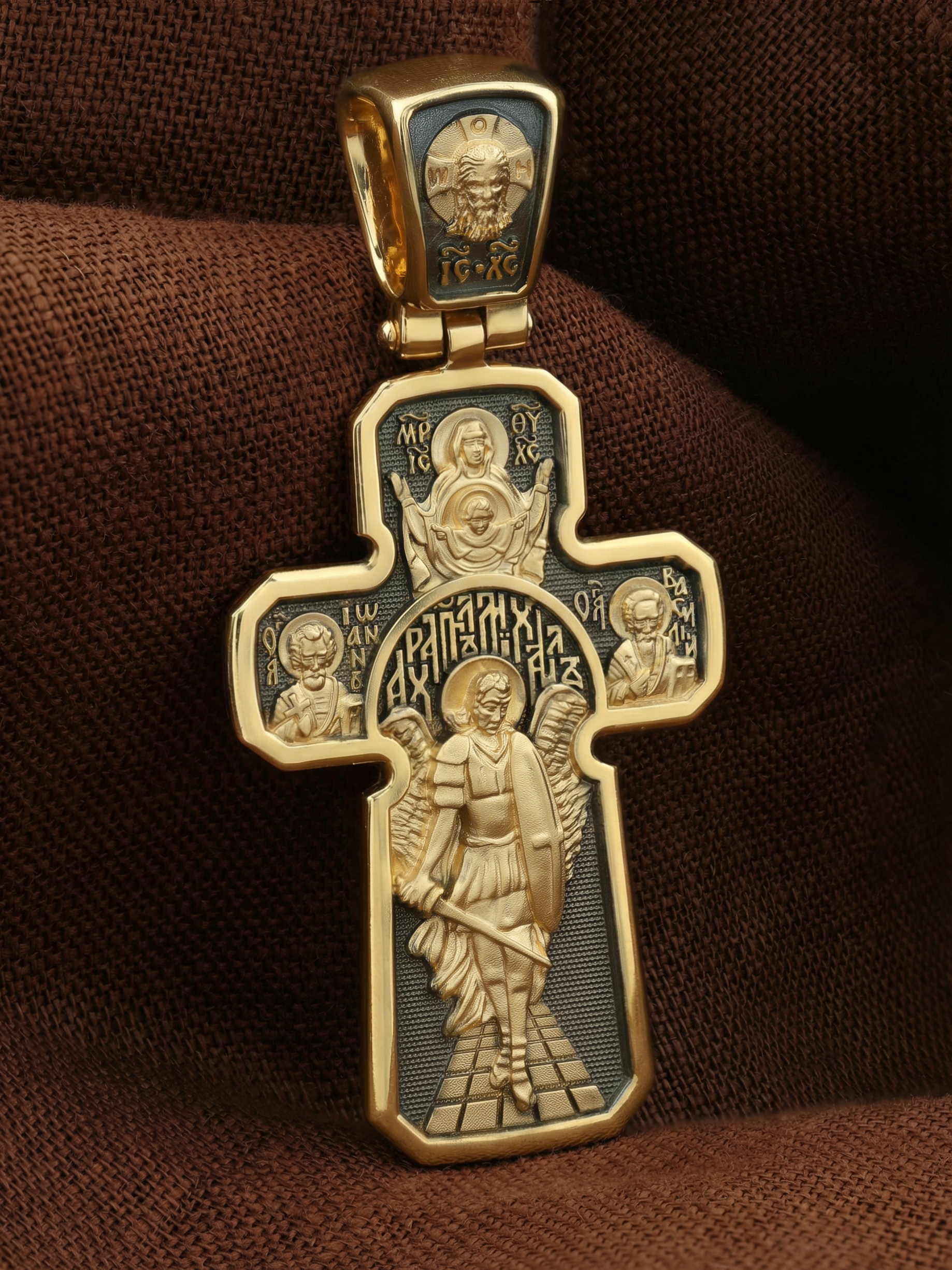 Основой композиции оборотной стороны является ростовое изображение Архангела Михаила — Архистратига всех Небесных Воинств. Он ведет непримиримую войну против сил зла, охраняет райские врата и защищает души людей. Крылатый Архангел изображен в воинском доспехе и плаще идущим по каменистой дороге. В правой руке он держит обнаженный меч, а в левой щит. С двух сторон Архангелу предстоят образы святителей Иоанна Златоуста (составитель Божественной Литургии) и Василия Великого (Вселенский учитель и один из отцов Церкви).