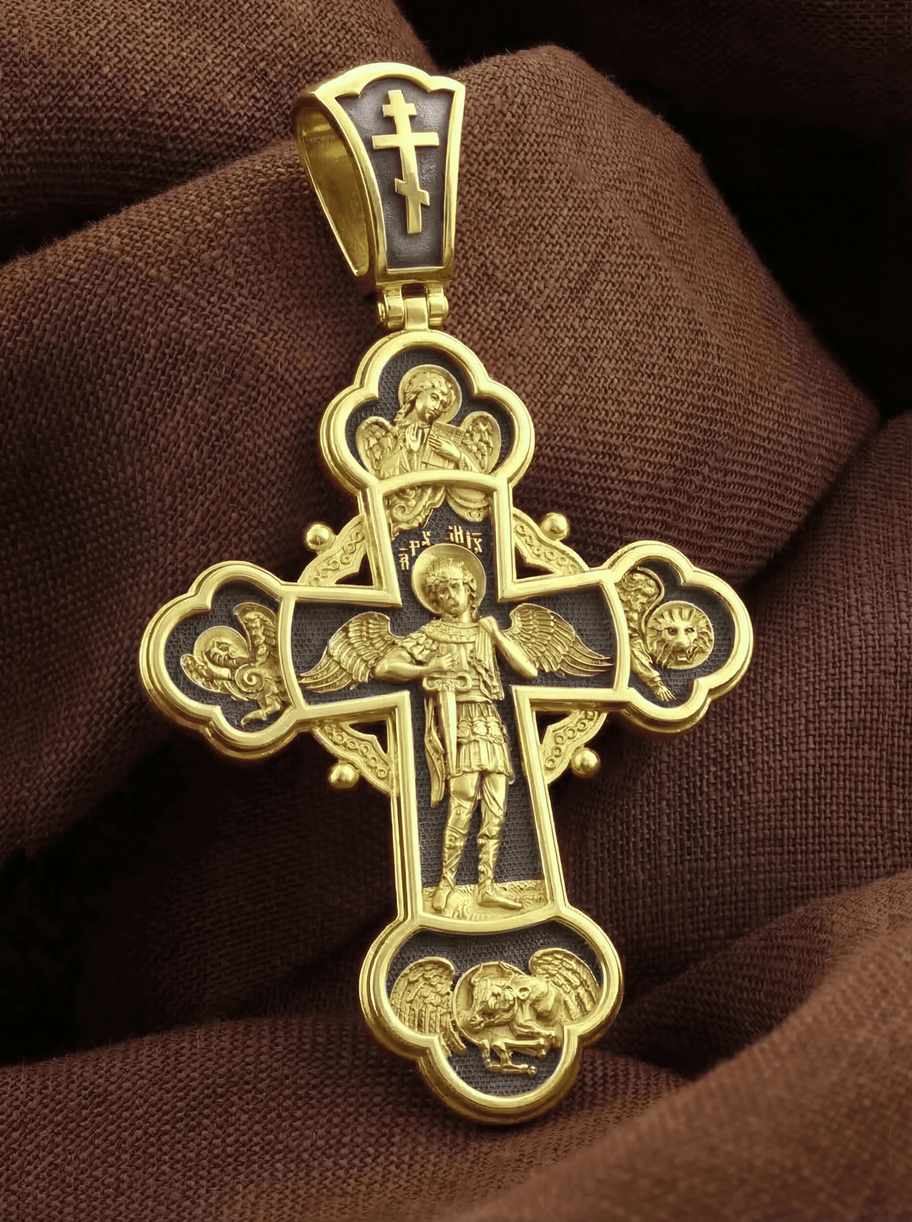 В центре оборота креста изображен Архистратиг Михаил. Могучий Архангел почитается как покровитель воинов и всех верных Богу и ведущих борьбу против сил зла, а также защитник душ умерших, страж райских врат. Над ним благословляющая десница — знак присутствия Бога. Архангел изображен в окружении символов четырех евангелистов: орел (Иоанн), лев (Марк), телец (Лука) и ангел (Матфей).
