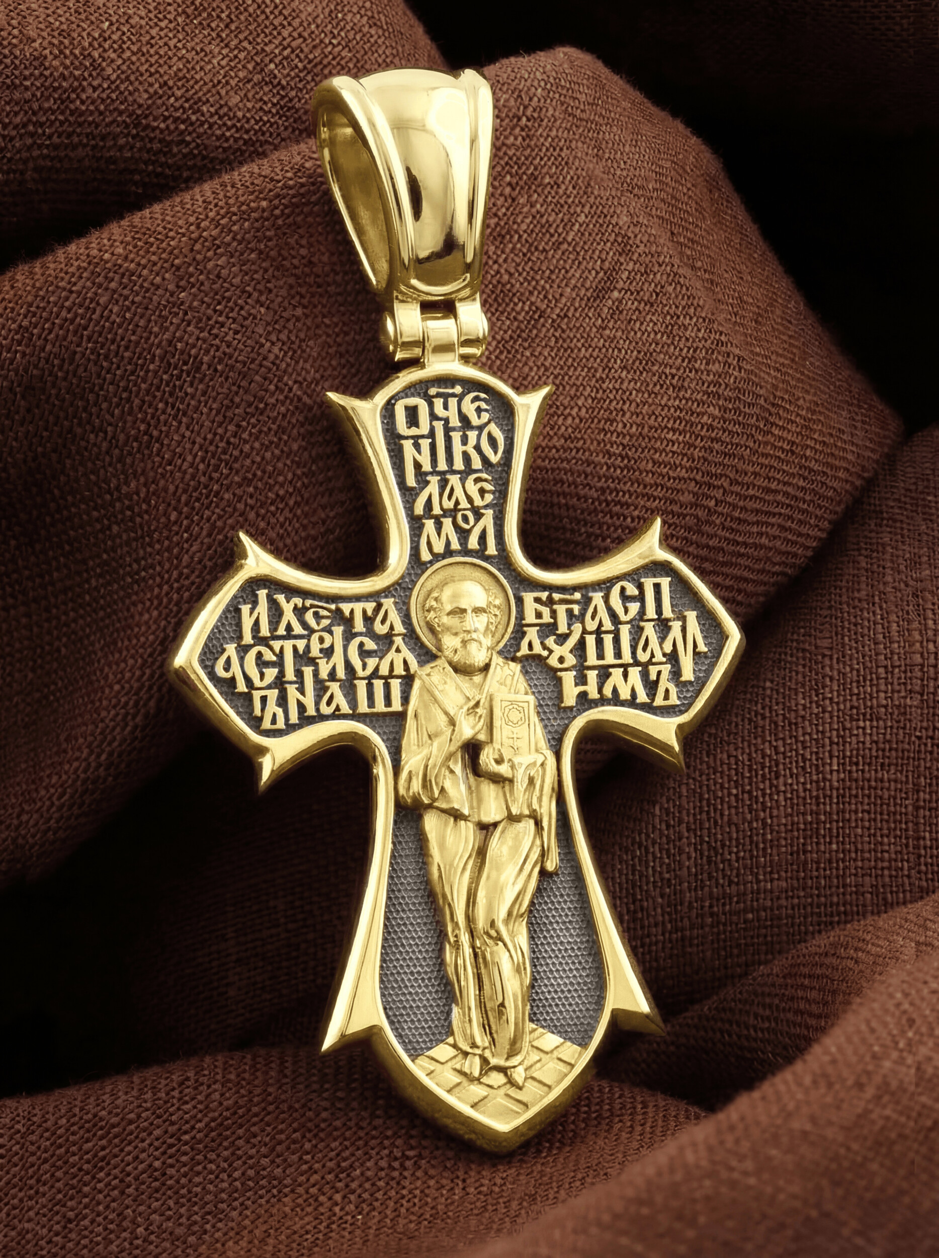 Оборотную сторону креста возглавляет икона святителя Николая Чудотворца. Живший в III веке епископ Ликийского города Миры — самый почитаемый святой не только в России, но и во всем мире. Николай Чудотворец, помощник в делах, защитник путешествующих, покровитель учащихся, утешитель обиженных и нуждающихся, целитель самых страшных и тяжелых недугов, предстатель и молитвенник за людей перед Богом. Вокруг него написана молитва: «Отче Николае, моли Христа Бога спастися душам нашим».