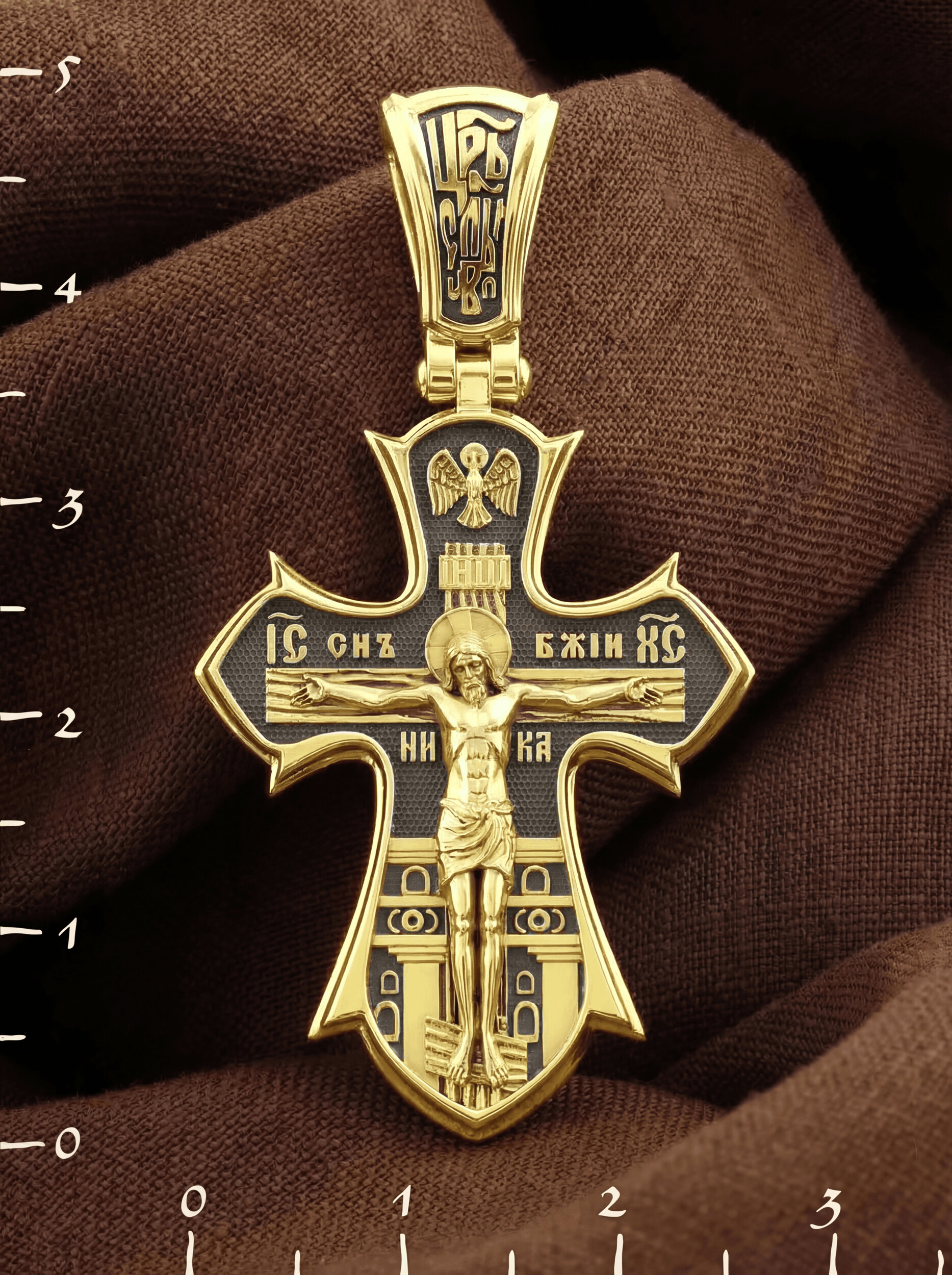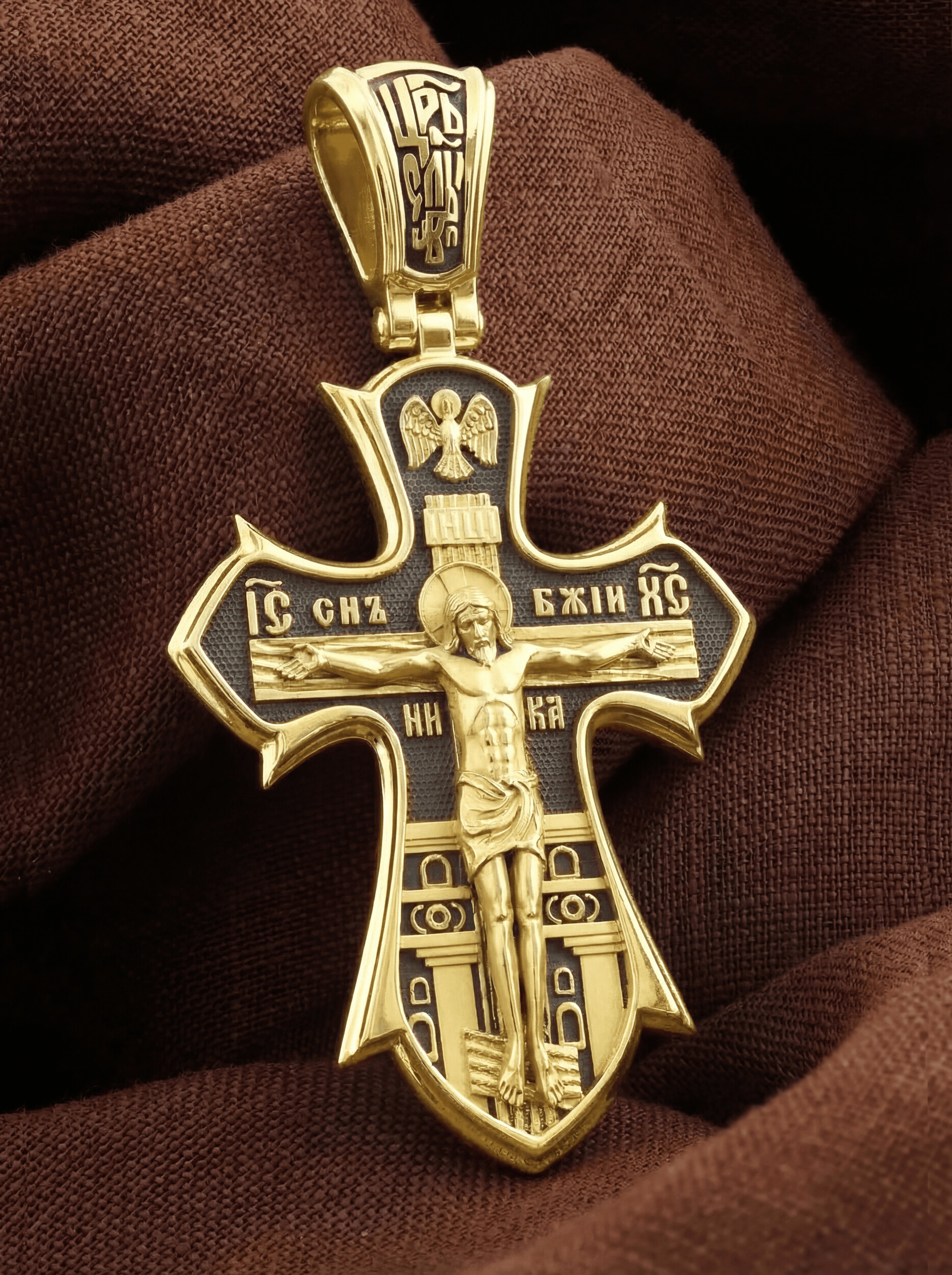 На лицевой стороне креста изображено Распятие Иисуса Христа. Господь представлен свободно покоящимся на кресте с простертыми руками и как бы обнимающим всю Вселенную. Он — Спаситель, искупивший грехи мира, «поправший смертию смерть» и призывающий к Себе «все концы земли». Поэтому рядом с Его образом помещены слова — «НИКА» и «Царь Славы». Эти слова характеризуют Господа как Великого Архиерея, победителя смерти. Верхняя перекладина символизирует титло — табличку, на которой, согласно Евангелию, было начертано: Иисус Назорей Царь Иудейский (IНЦI). Также Распятие сопровождается надписями, олицетворяющими Христа. Это святое имя Христа «IC» (Иисус) «ХС» (Христос), и словосочетание «СЫН БОЖИЙ».