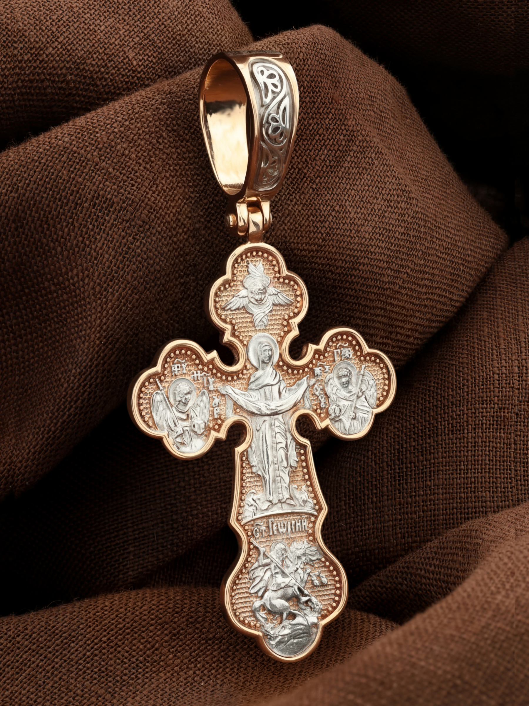 Центральную часть оборотной стороны креста украшает икона Божией Матери «Покров Пресвятой Богородицы». Праздник Покрова Пресвятой Богородицы пришел на Русь в XII веке из Византии и стал одним из самых почитаемых. Пресвятая Богородица простирает Свой молитвенный покров над всеми православными христианами и умоляет Сына своего о даровании вечного спасения каждому человеку. Над образом помещен шестикрылый Серафим. Справа помещено изображение Архангела Гавриила, слева- Архангела Михаила. На кресте внизу помещено изображение Святого Великомученика Георгия Победоносца — одного из самых почитаемых и удивительных святых. Он изображен как воитель, сидящий на вздыбленном коне и поражающий копьем огнедышащего змея. Змей символизирует собою сатанинские силы.