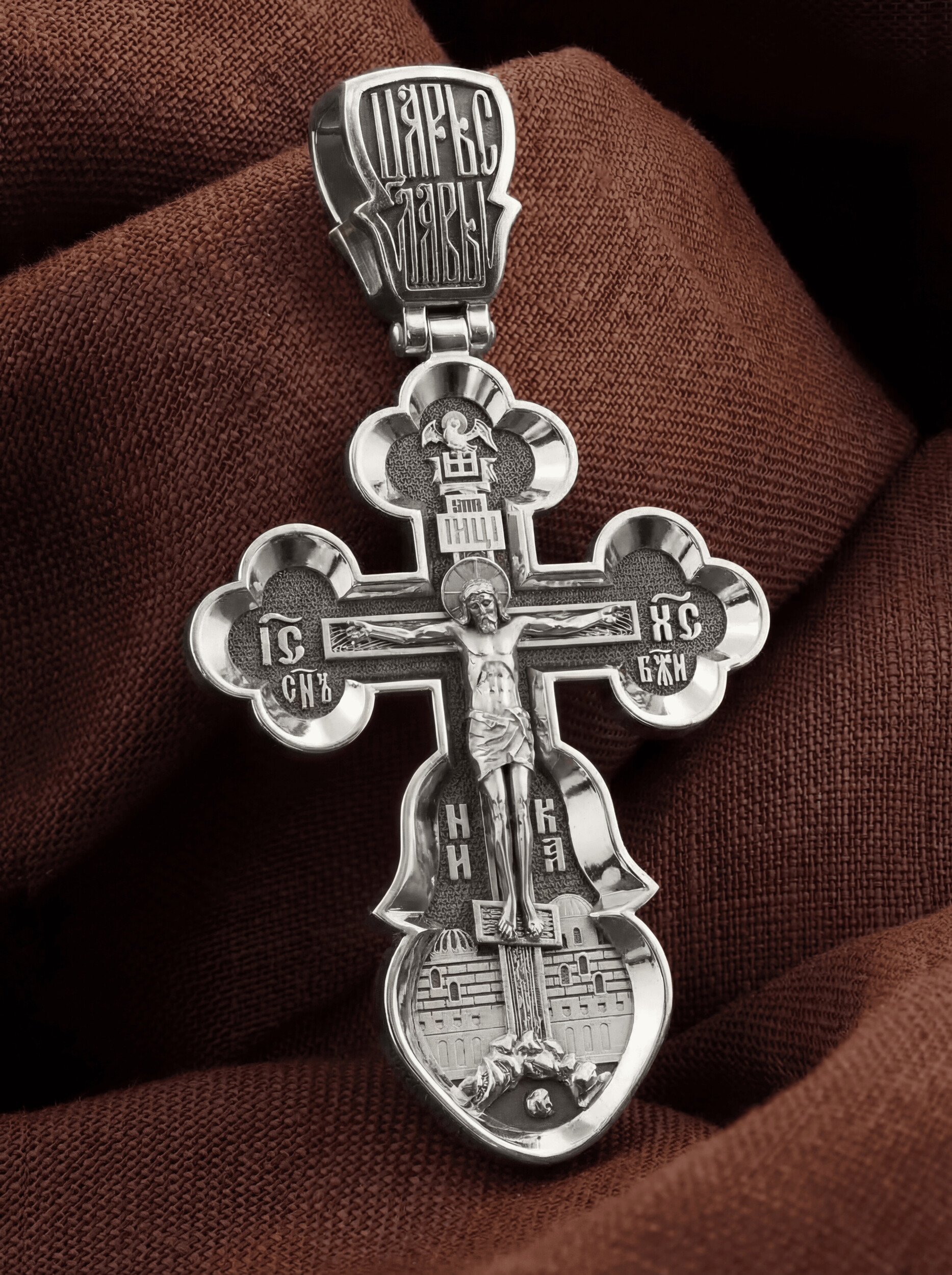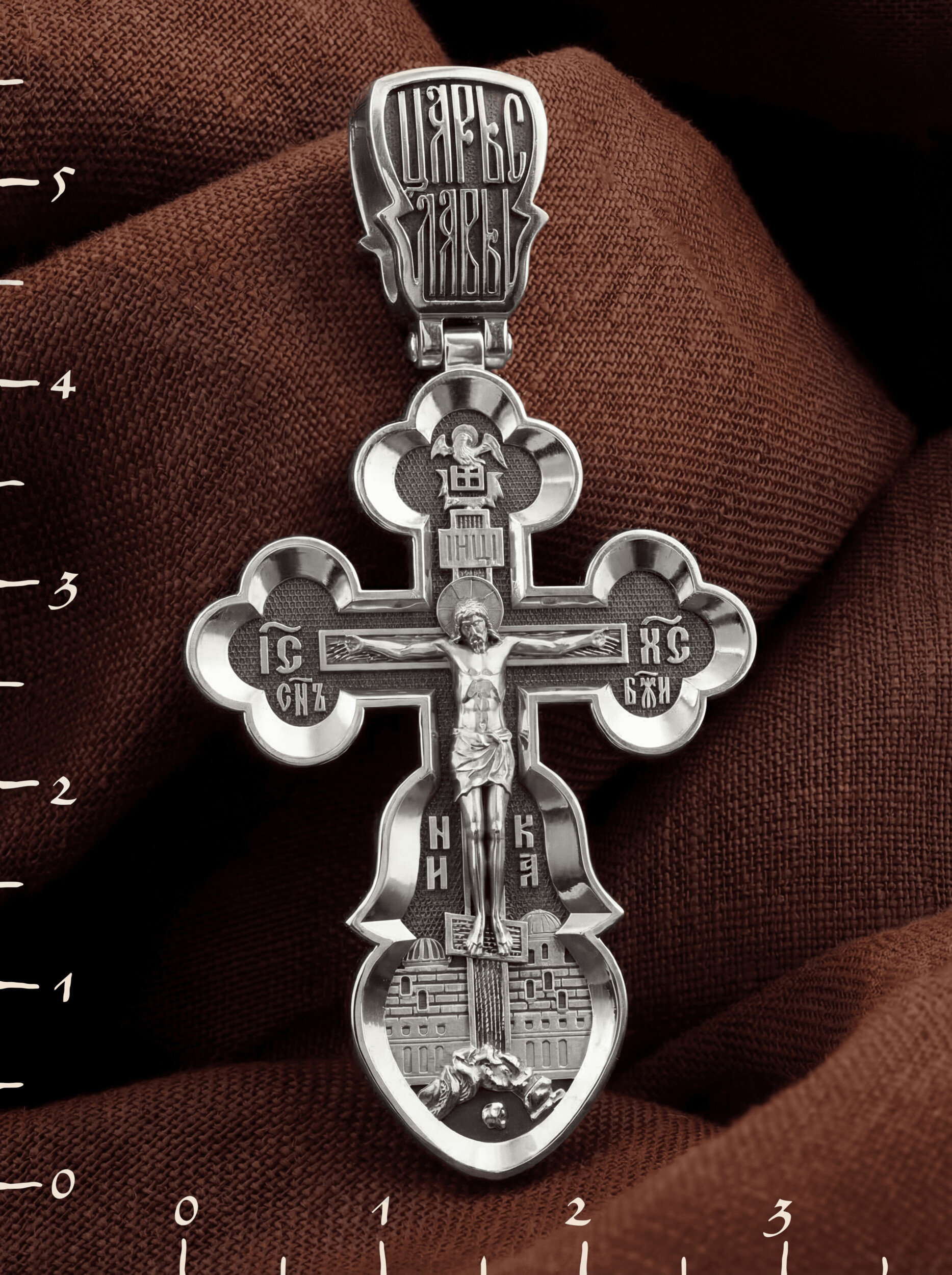 Распятие сопровождается иконографическими надписями, прославляющими Господа Иисуса Христа. На боковых оконечностях размещены инициалы святого имени Спасителя «IС ХС» и надпись «Сын Божий», обозначающая Его божественную природу. На подножии Креста можно прочитать надпись «НИКА» (Победитель) — символ победы Господа над смертью. Венчает лицевую сторону образ Святого Духа в виде голубя.