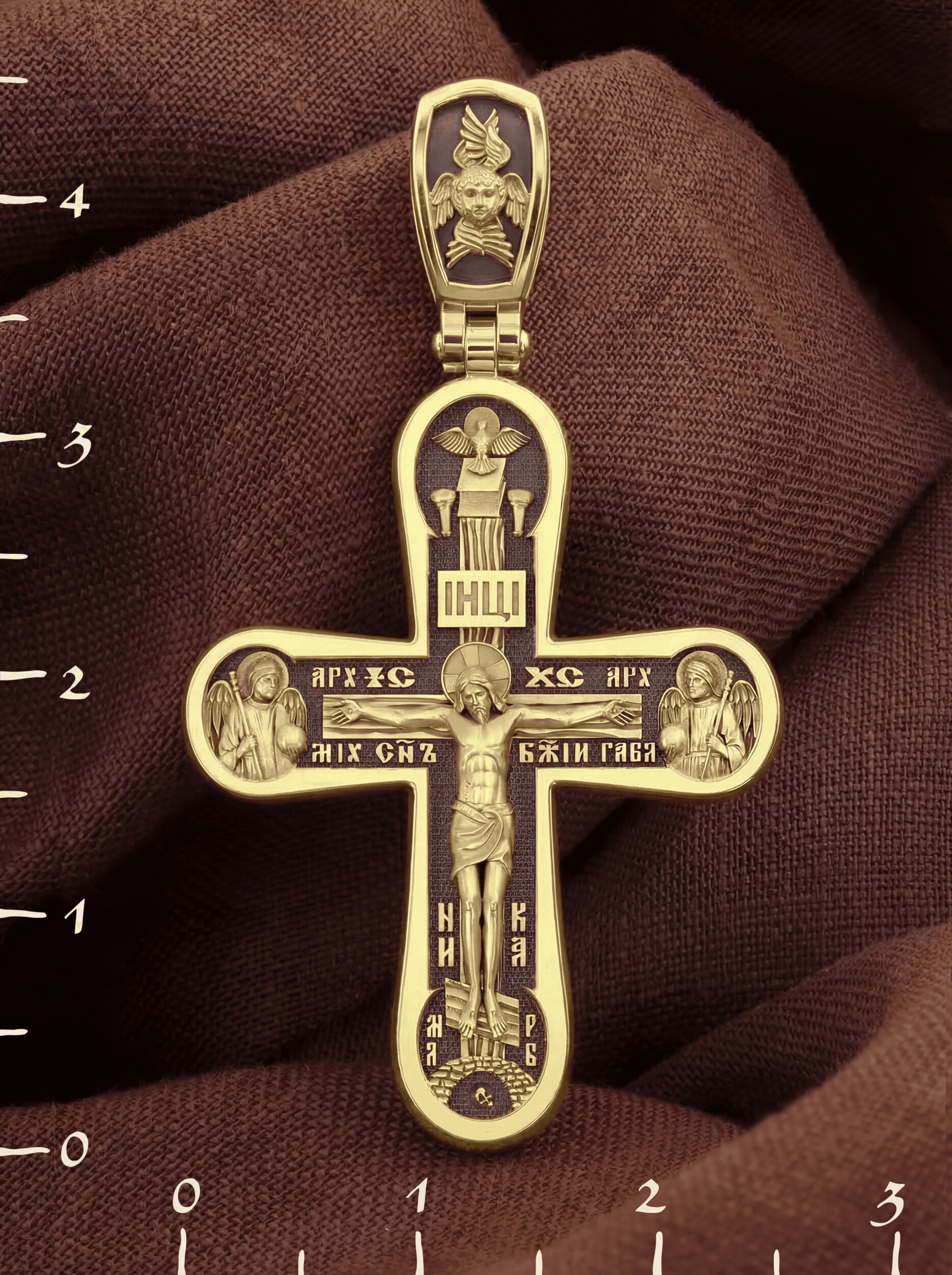 Центральную часть лицевой стороны занимает Распятие Господа Иисуса Христа. Крест стоит на горе камней, символизирующих Голгофу, в основании которой различается череп. Это голова Адама. С обеих стон Его стоят Архангелы: покровитель воинов и всех верных Богу, защитник душ умерших, страж райских ворот — Архистратиг Михаил; и Архангел Гавриил — небесный вестник, покровитель музыкантов и учителей.