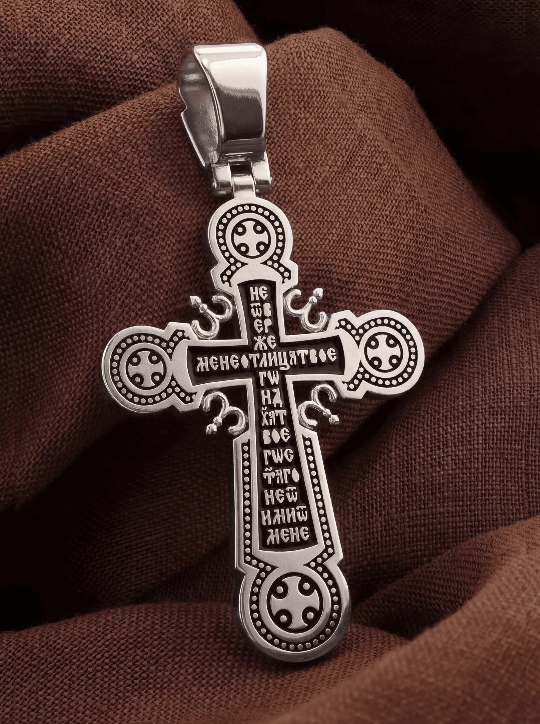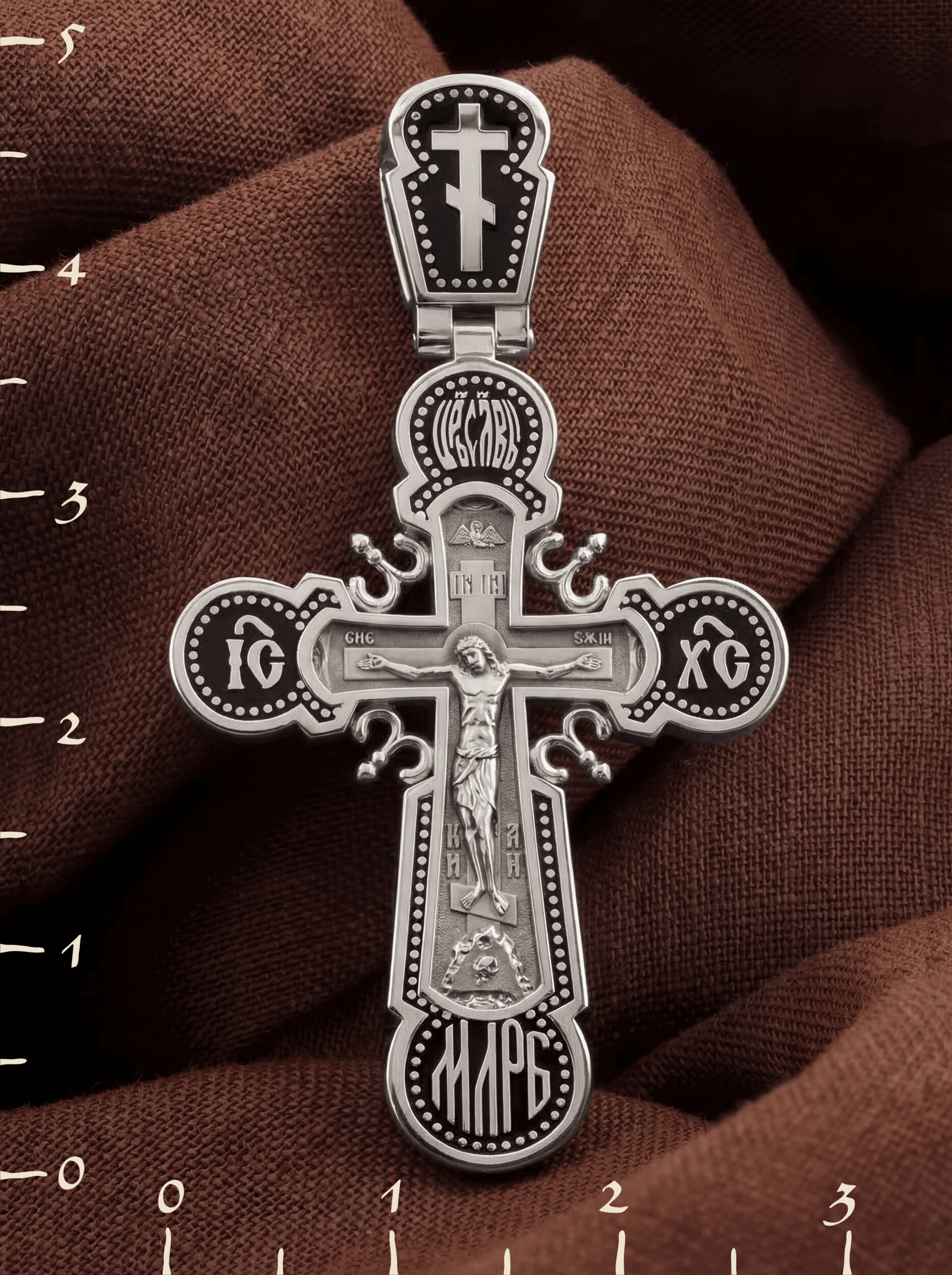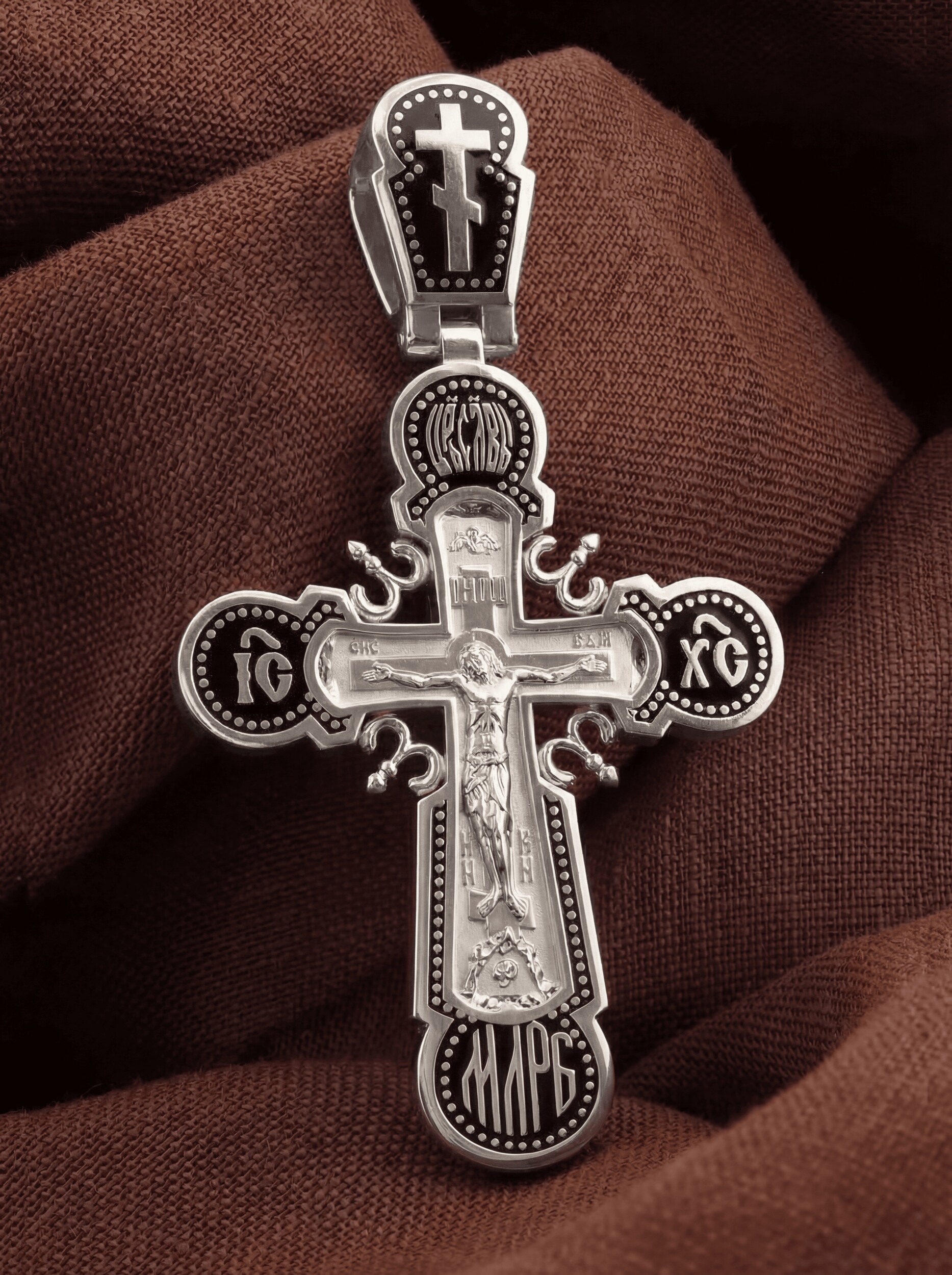На лицевой стороне креста изображено Распятие Господа и Спасителя нашего Иисуса Христа. Крест- символ спасения и искупления рода человеческого, знамение победы над смертью и адом. Иисус Христос, как искупительная жертва освобождения человечества от власти греха, умер крестной смертью и в третий день воскрес. Над вершиной Распятия помещена надпись «Царь Славы» и изображение Духа Святого в виде голубя, сходящего с небес. На верхней табличке, выше головы Иисуса, расположена надпись, составленная Понтием Пилатом — «IНЦI». Она означает «Иисус Назорей, Царь Иудейский». Надпись «IС» « ХС» означает Иисус Христос и помещается на разных сторонах поперечной перекладины креста. Ниже — слово «НИКА», что означает «победитель». Надпись «МЛРБ» — «место лобное рай бысть» означает, что место лобное стало раем, помещается в нижней части креста. Крест стоит на горе камней, символизирующих Голгофу. В ее основании различается череп — это голова Адама. На православном кресте Христос не умирает, а свободно простирает руки, ладони Иисуса открыты, будто он хочет обнять все человечество, даря им свою любовь и открывая путь к вечной жизни. На кулонном кольце помещен крест.