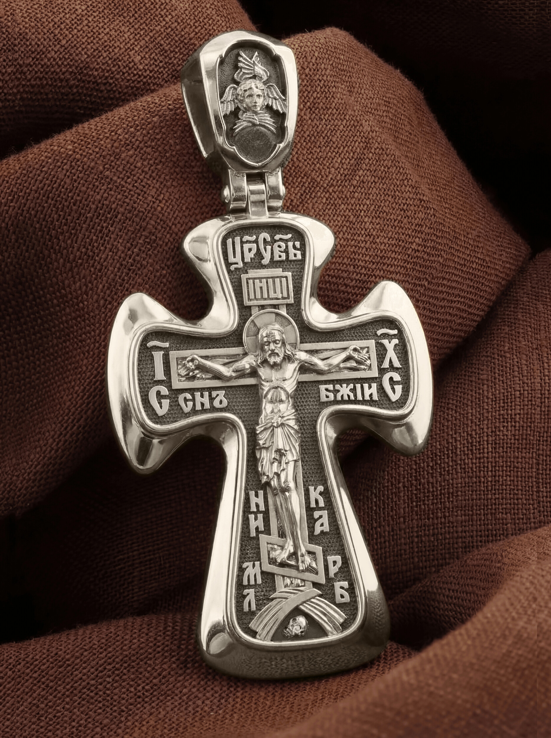 На лицевой стороне креста изображено Распятие Иисуса Христа. Господь представлен свободно покоящимся на кресте с простертыми руками и как бы обнимающим всю Вселенную. Он — Спаситель, искупивший грехи мира, «поправший смертию смерть» и призывающий к Себе «все концы земли». Поэтому рядом с Его образом помещены слова — «НИКА» и «Царь Славы». Эти слова характеризуют Господа как Великого Архиерея, победителя смерти. Также Распятие сопровождается надписями, олицетворяющими Христа. Это святое имя Христа «IC» (Иисус) «ХС» (Христос), и словосочетание «СЫН БОЖИЙ».
