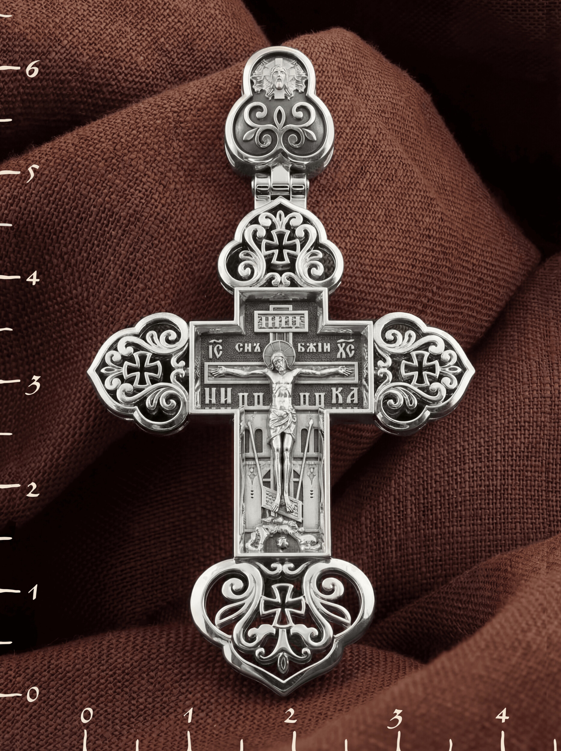 На лицевой стороне изображено Распятие. Позади Распятия видна иерусалимская стена, знак того, что Господь был распят вне стен города. Но вместе с тем стена символизирует и Небесный Иерусалим, путь который открылся для человека через Голгофу. У подножья Господа в виде скалистой горки видна сама Голгофа с Главой Адамовой в пещере. Рядом с Крестом из горы выступают орудия страданий Господа — трость и копие, обозначенные буквами Т и К. На трости стражники подали Христу пропитанную уксусом губку, когда Он жаждал воды, а копьем пронзили Ему ребра, чтобы проверить: умер ли Он?