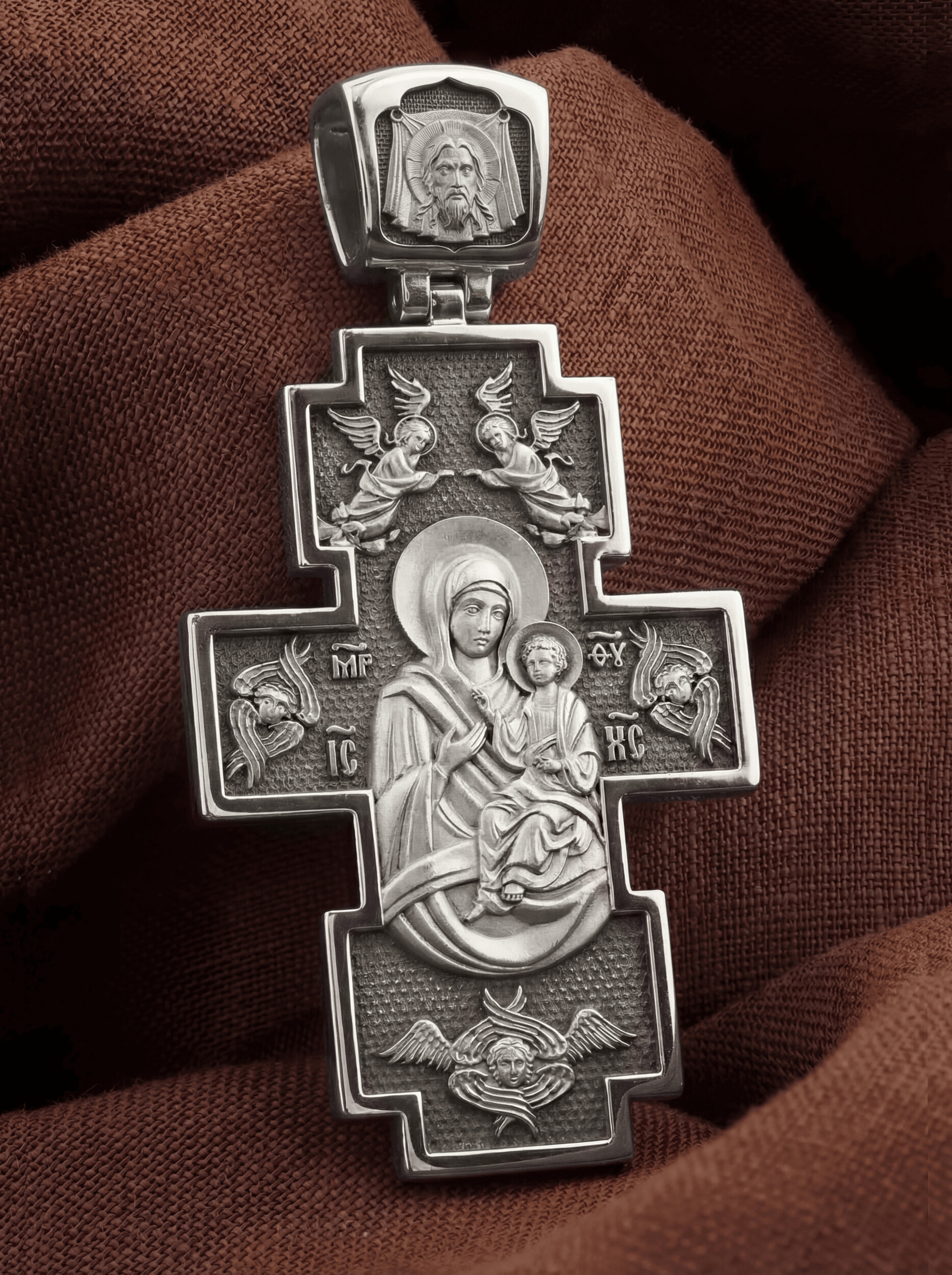 На лицевой стороне креста изображено Распятие Христово — величественный, торжественный образ христианства, знак победы над смертью. Христос, принеся Себя в Жертву на Кресте, искупил грехи всего мира и дал людям возможность обрести спасение. Слева и справа от Креста стоят Богоматерь и апостол Иоанн Богослов. По преданию, именно они до последнего не оставляли Спасителя в Его страданиях, были с Ним до самой смерти. Во главе образка изображен парящий голубь — символ Святого Духа и Его благодати. Сверху над Распятием парят Ангелы. Они изображены летящими с Небес вниз, к Кресту. Ангелы словно поддерживают табличку над головой Спасителя, на которой написано IНЦИ — «Иисус Назарянин Царь Иудейский». Эта табличка — титло — была приколочена римскими палачами как указание на «вину» Христа, то, за что Он был казнен.