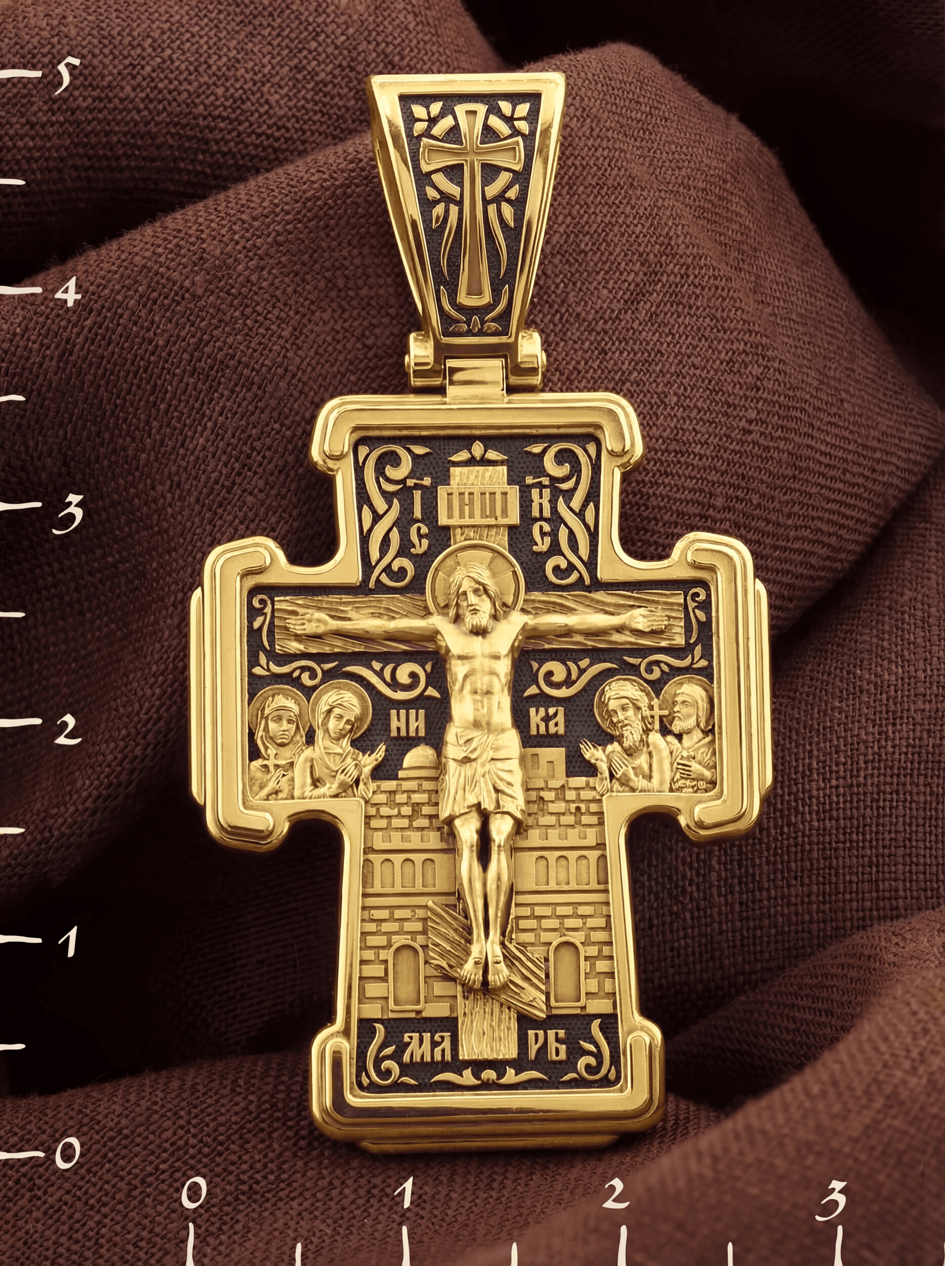 На лицевой стороне креста изображено Распятие Господа и Спасителя нашего Иисуса Христа. Крест- символ спасения и искупления рода человеческого, знамение победы над смертью и адом. Иисус Христос, как искупительная жертва освобождения человечества от власти греха, умер крестной смертью и в третий день воскрес. На верхней табличке, выше головы Иисуса, расположена надпись, составленная Понтием Пилатом — «IНЦI». Она означает «Иисус Назорей, Царь Иудейский». Рядом расположена надпись «IС» « ХС». Она означает Иисус Христос. Ниже — слово «НИКА», что означает «победитель». Слева от Распятия — Пресвятая Богородица и святая мироносица Мария Магдалина с крестом в руке. Справа — апостол и евангелист Иоанн Богослов, один из ближайших учеников Иисуса Христа, и сотник Лонгин с крестом в правой руке и копьем — в левой. За крестом высится Иерусалимская стена. Надпись «МЛРБ» — «место лобное рай бысть» означает, что место лобное стало раем, помещается в нижней части креста. На кулонном кольце помещен крест.