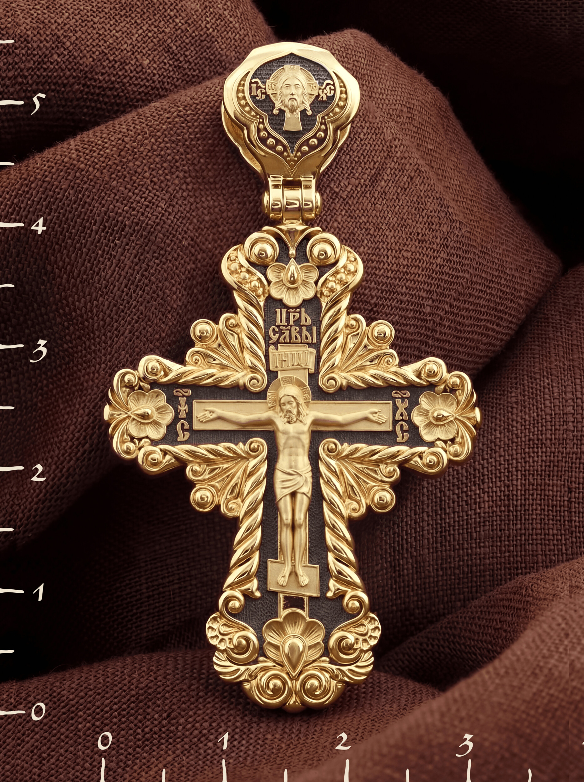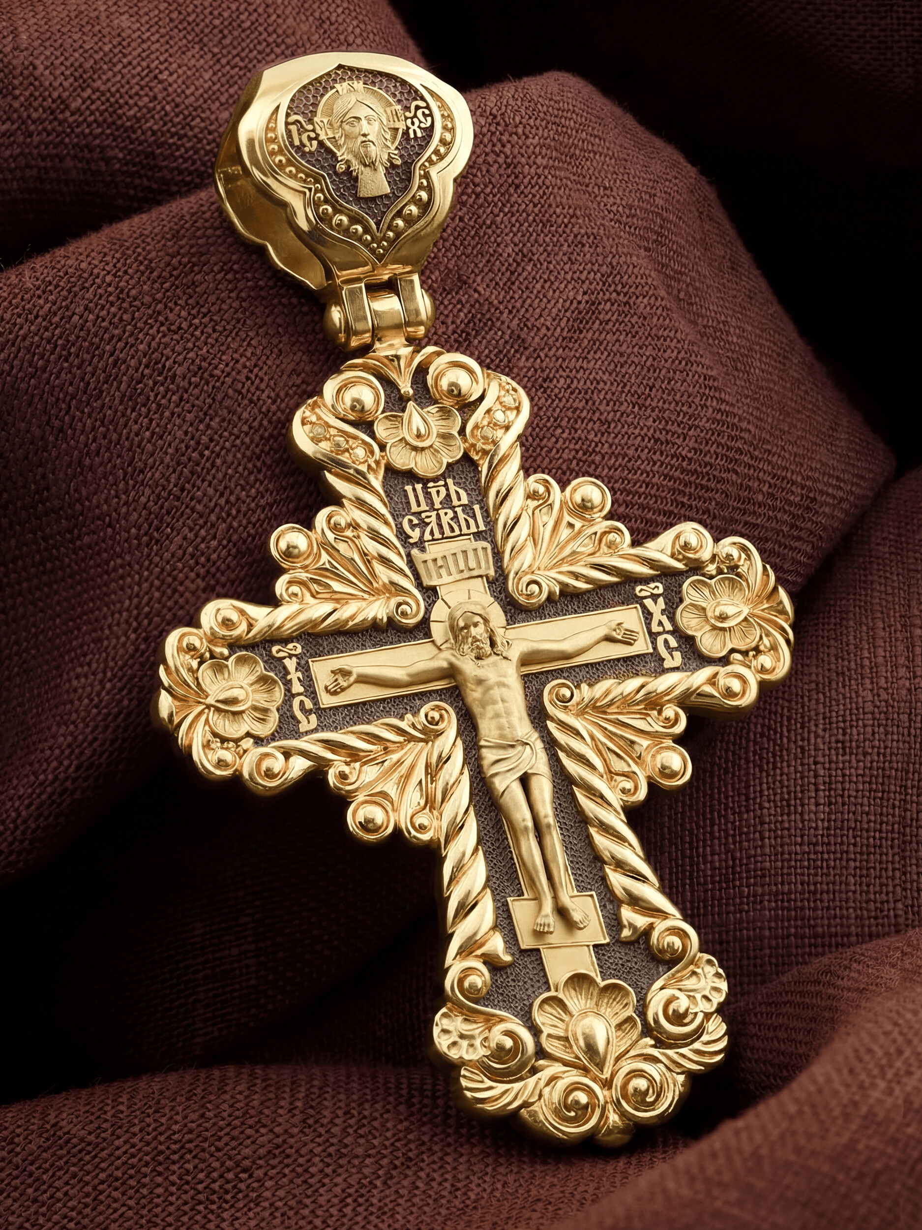 На лицевой стороне креста изображено Распятие Господа и Спасителя нашего Иисуса Христа, отдавшего Себя на смерть, для искупления грехов мира. Крест является символом жертвенной любви Всеблагого Бога к падшим людям, всепобеждающим духовным оружием христиан, основанием и средоточием церковной жизни. Господь сказал: кто хочет идти за Мною, отвергнись себя, и возьми крест свой, и следуй за Мною. (Мк. 8: 34). Над Распятием помещена надпись «Царь Славы». На верхней табличке, выше головы Иисуса, расположена надпись, составленная Понтием Пилатом — «IНЦI». Она означает «Иисус Назорей, Царь Иудейский». Надпись «IC» «ХC», означает Иисус Христос, помещается на разных сторонах поперечной перекладины креста. На кулонном кольце изображен Нерукотворный образ Господа и Спасителя нашего Иисуса Христа, чудесно отпечатавшийся на плате, которым Христос вытер свой лик.