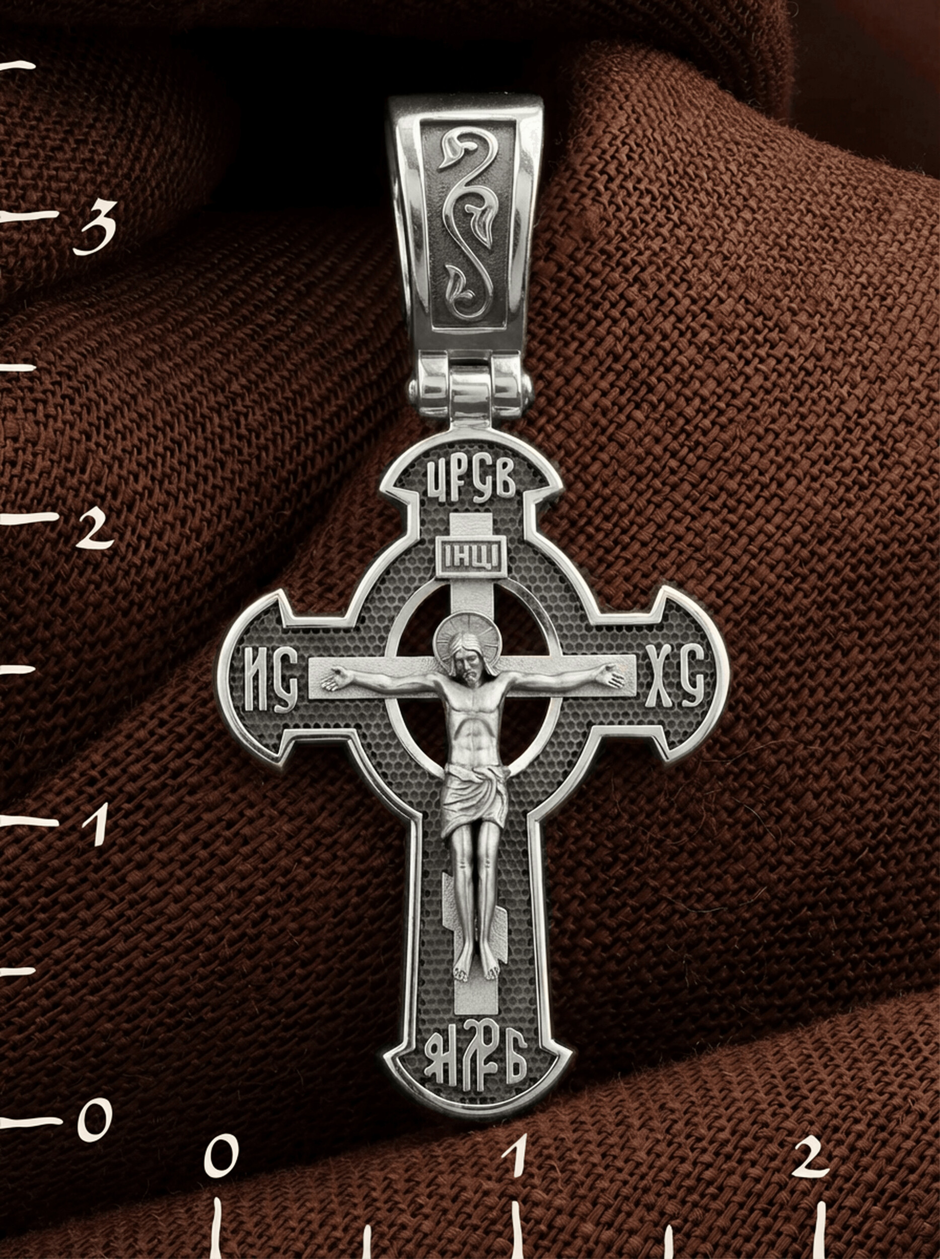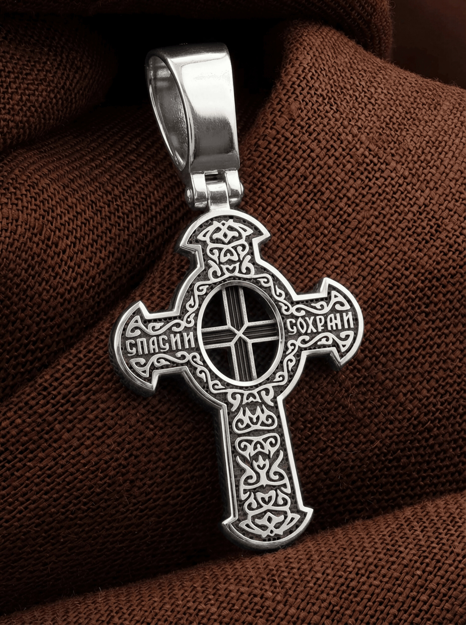 Оборотная сторона креста украшена растительным орнаментом. Помещенный на крест орнамент символизирует жизнедательную силу, животворное тепло креста. В растительный узор, на горизонтальной перекладине, вписано молитвенное славословие: «Спаси и сохрани». Эта надпись означает непрерывную молитву, совершаемую носителем данного креста.