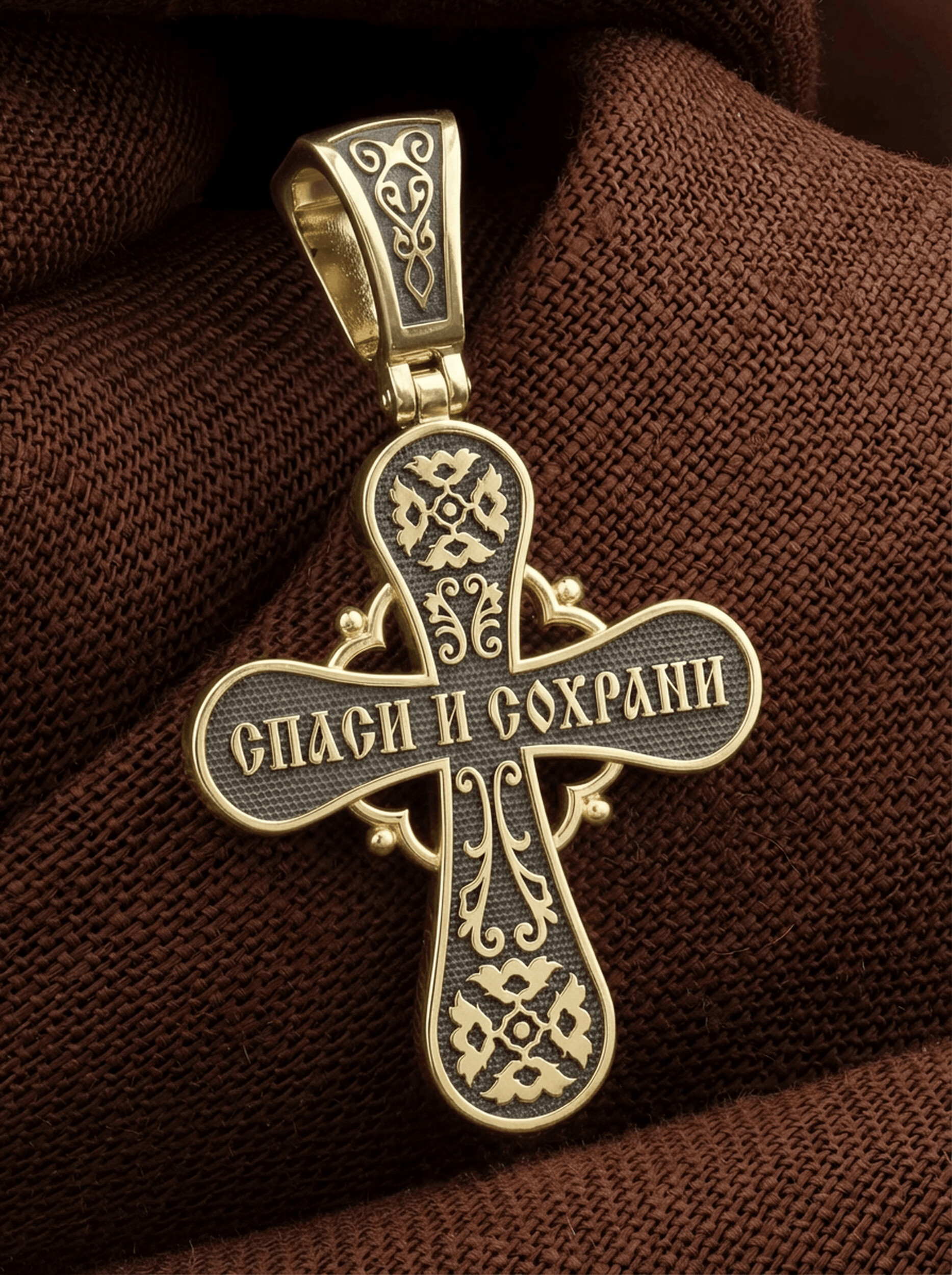 На обороте данного креста, в окружении изящного растительного узора, написано молитвенное славословие: «Спаси и сохрани».