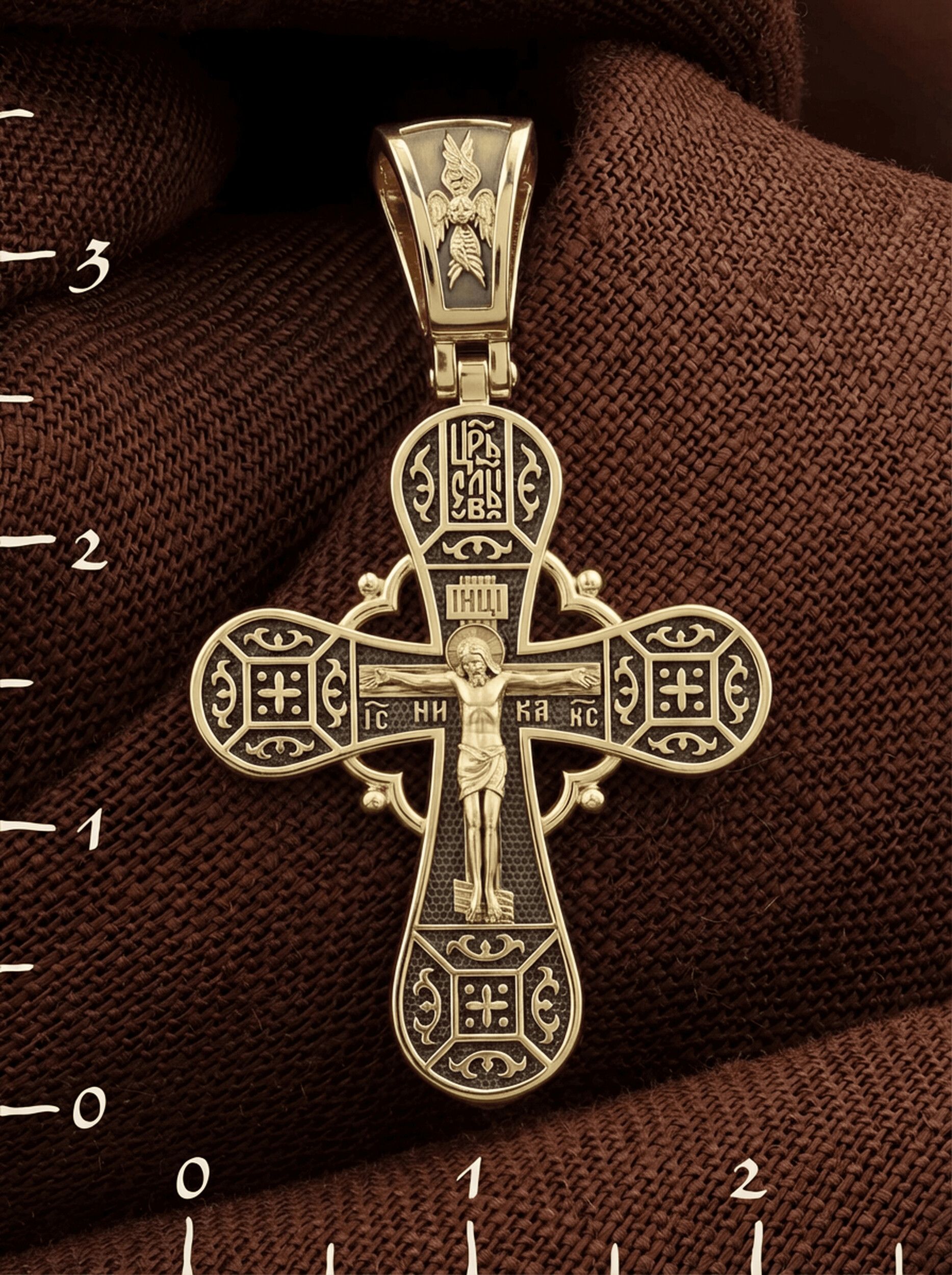 На лицевой стороне креста изображено Распятие, потому что это орудие казни Иисус Христос сделал орудием победы над грехом и смертью. Своими страданиями Он искупил грехи человечества, умерев и сошествовав во ад, победил сатану, освободил души праведников от вечной смерти и открыл им небесные врата рая. Жертва Христа сделала возможным спасение для каждого человека. На православном кресте Христос не умирает, а свободно простирает руки, ладони Иисуса открыты, будто он хочет обнять все человечество, даря им свою любовь и открывая путь к вечной жизни. Над титлом видим слова «ЦРЬ СЛВЫ» — Царь Славы. Верхняя перекладина символизирует собой табличку с надписью «IHЦI» — Иисус Назарянин Царь Иудейский. Под перекладиной пишется сокращенно имя Спасителя «IC XC» — Иисус Христос, рядом добавляется: «НИКА» (греч. — Победитель). Возвышение, на котором стоит Крест, символизирует гору Голгофу, на которой произошло Распятие. У подножия Креста изображают прах Адама, обозначенный черепом.