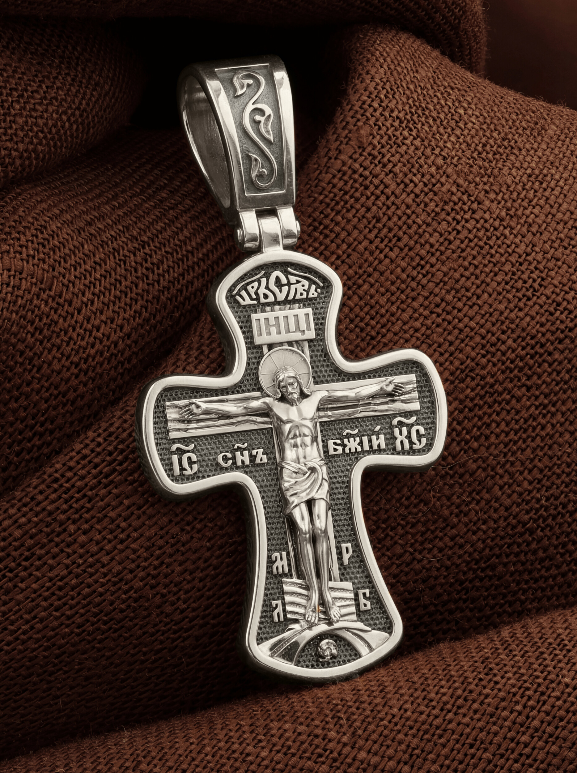 Крест четырехконечный со слегка расширяющимися лопастями. Такая форма креста имеет многочисленные духовные смыслы. Ее устремленная ввысь вертикаль означает справедливость и непреложность Божественных заповедей, прямоту Божией правды и истины, не допускающей никаких нарушений. Эта прямота пересекается поперечной перекладиной, означающей любовь и милость Божию к грешным людям. На лицевой стороне креста изображено Распятие, потому что это орудие казни Иисус Христос сделал орудием победы над грехом и смертью. На лицевой стороне креста изображено Распятие Иисуса Христа. Над титлом видим слова «ЦРЬ СЛВЫ» — Царь Славы. Верхняя перекладина символизирует собой табличку с надписью «IHЦI» — Иисус Назарянин Царь Иудейский. Над перекладиной пишется сокращенно имя Спасителя «IC XC» — Иисус Христос и словосочетание «СНЪ БЖIЙ» — «СЫН БОЖИЙ». Две пары букв на кресте «МЛ» «РБ» означают: Место Лобное Рай Бысть. Возвышение, на котором стоит Крест, символизирует гору Голгофу, на которой произошло Распятие. У подножия Креста изображают прах Адама, обозначенный черепом.
