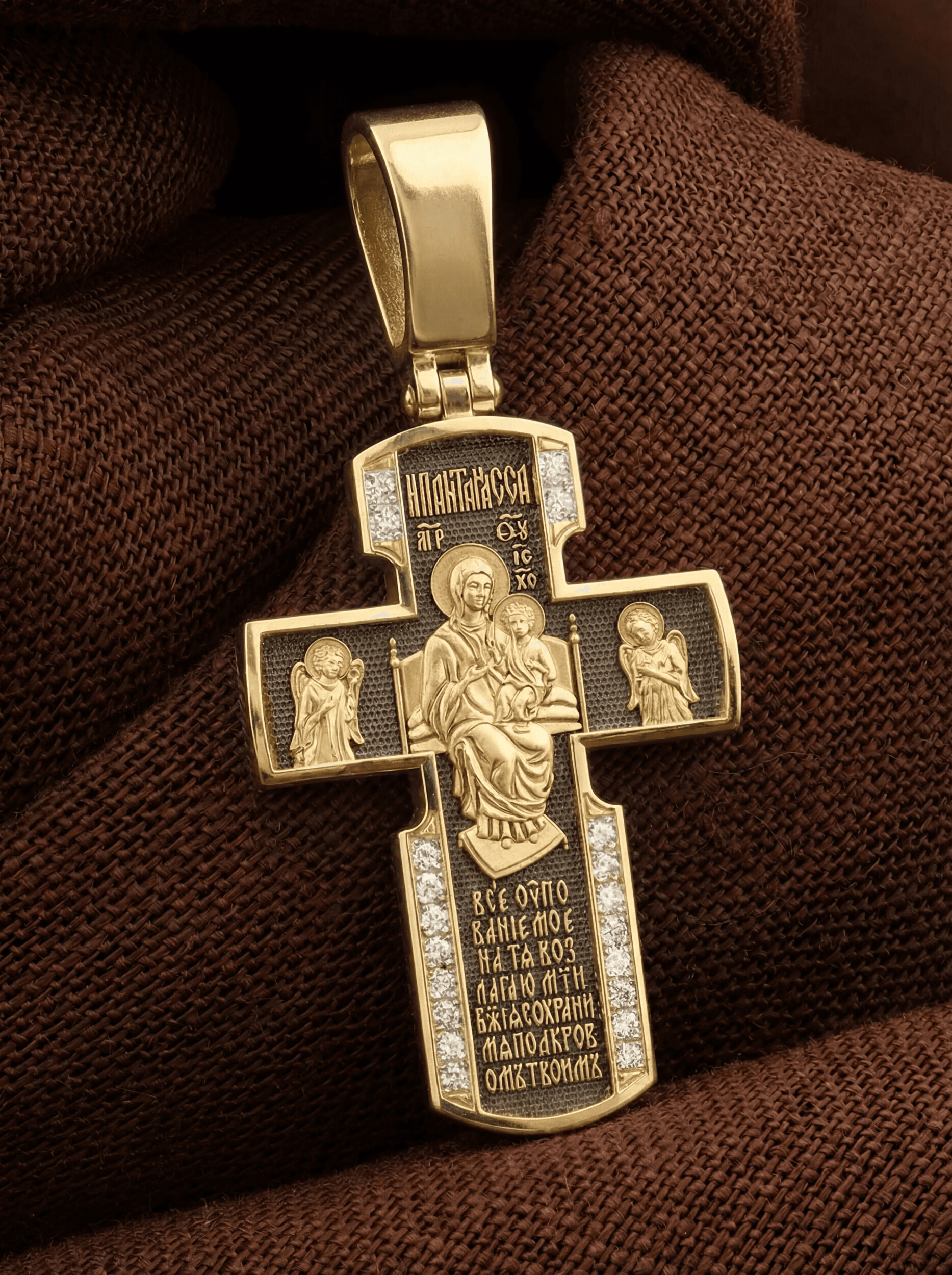 Внизу креста написана молитва обращенная к Божией Матери «Все упование мое на Тя возлагаю, Мати Божия, сохрани мя под кровом Твоим».