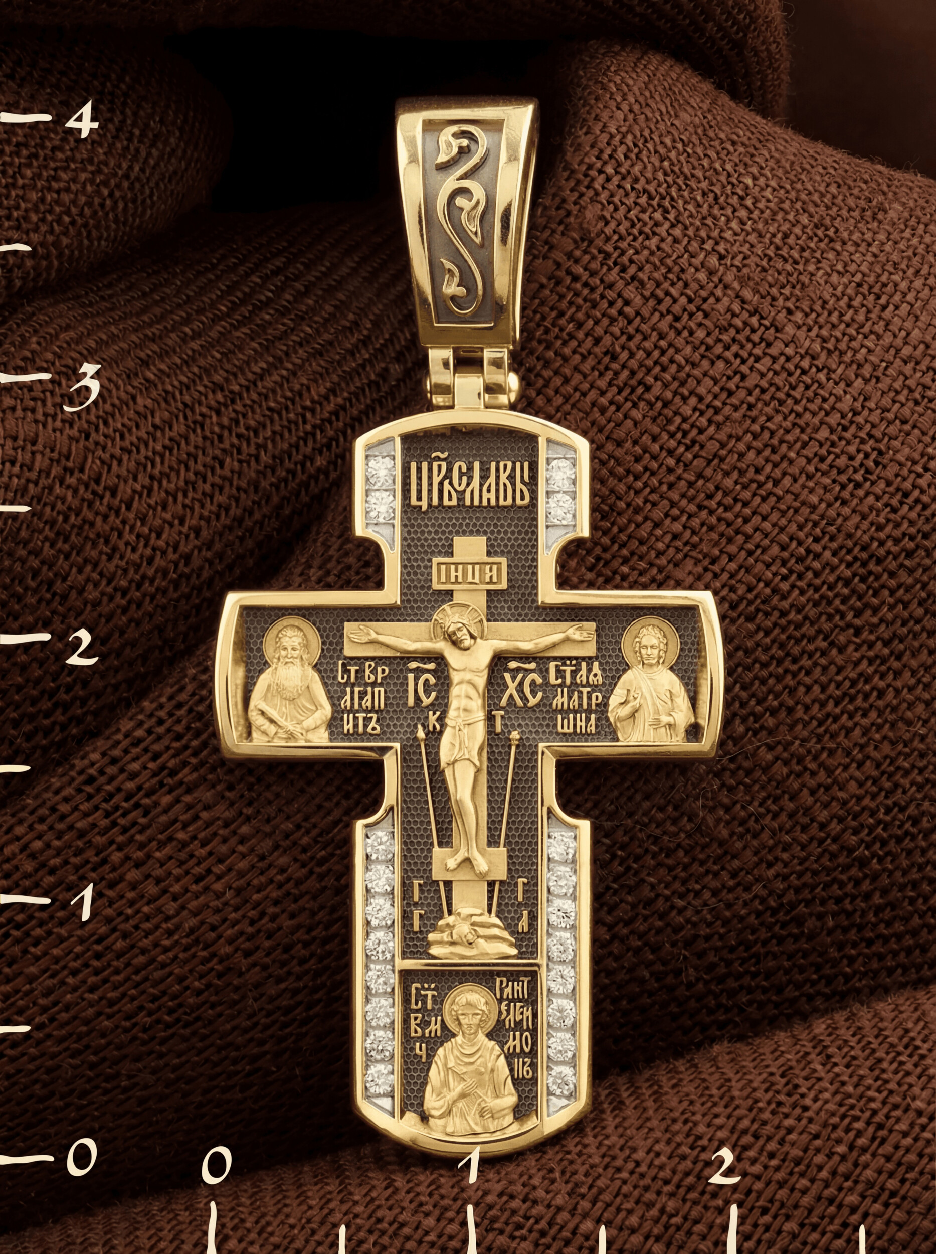 На лицевой стороне креста изображено Распятие Иисуса Христа на Голгофском Кресте, над вершиной которого помещена надпись «Царь Славы». Справа от Распятия помещен образ прославленной святой блаженной Матроны. «Матронушка», — ласково называют эту святую православные за удивительную любовь и помощь, которую она подает всем нуждающимся в ее поддержке. Слева — икона прп. Агапита. Этот святой жил в пещерах Киево-Печерского монастыря в XI веке и бескорыстно врачевал мирян и монахов.